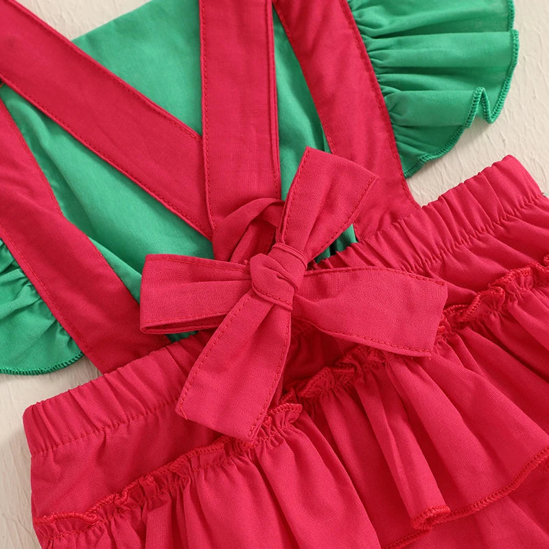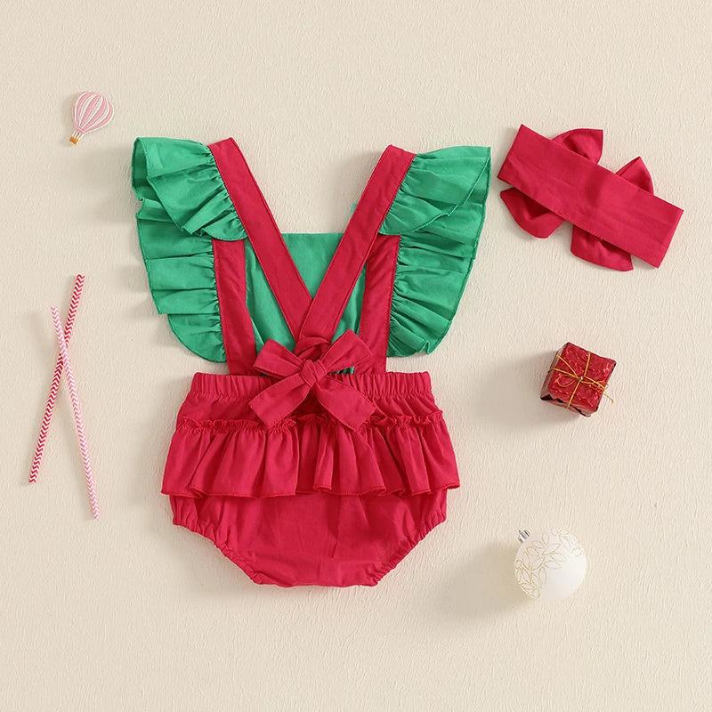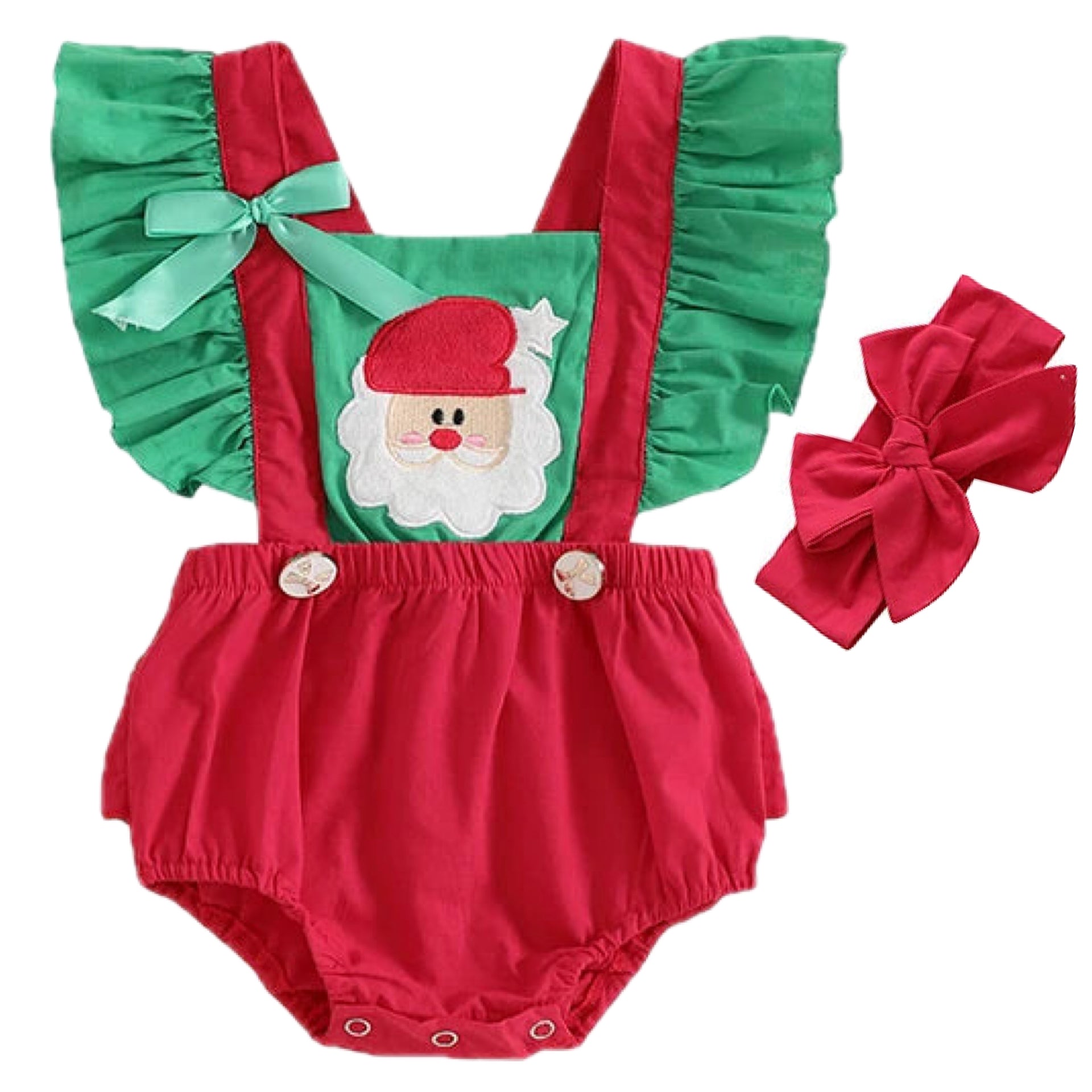 Celebrate Christmas with festive flair in our Baby Girl Santa Embroidered Overall Romper Set. Featuring a vibrant red bottom with adorable green flutter sleeves and a crossover overall-style design, this romper combines comfort with holiday cheer. The standout embroidered Santa on the front and two mini faux buttons create a charming overall look, while the adjustable red tie-up straps ensure the perfect fit. Made from a soft polyester-cotton blend, this romper includes a matching red bow headband to complete the outfit. Ideal for Christmas Day, festive photoshoots or gifting.