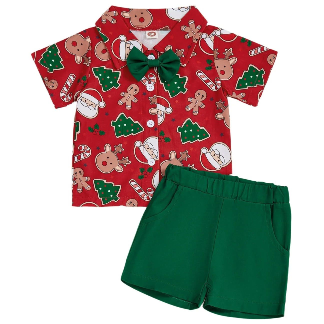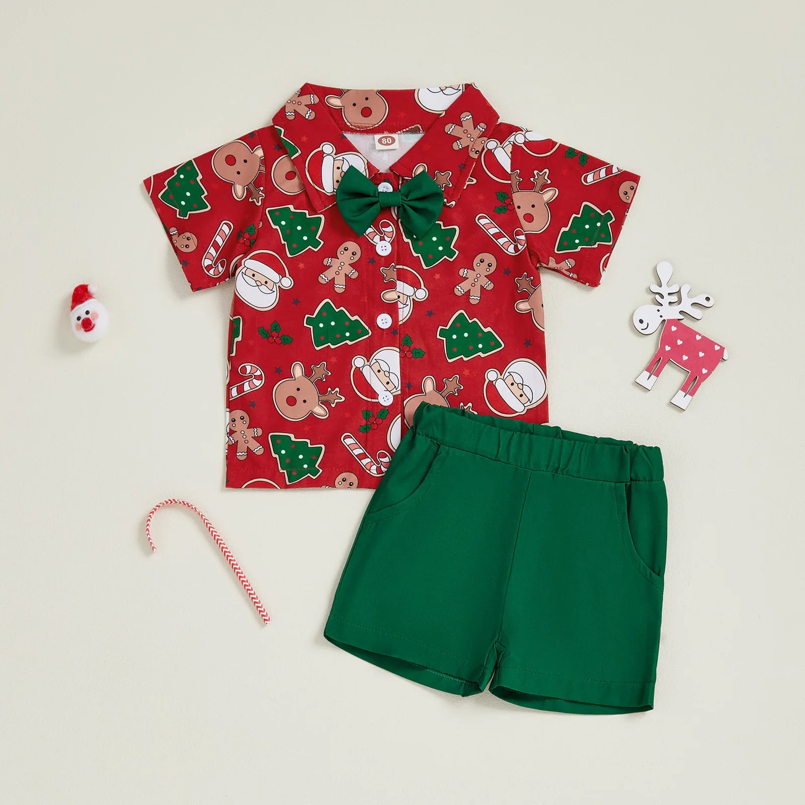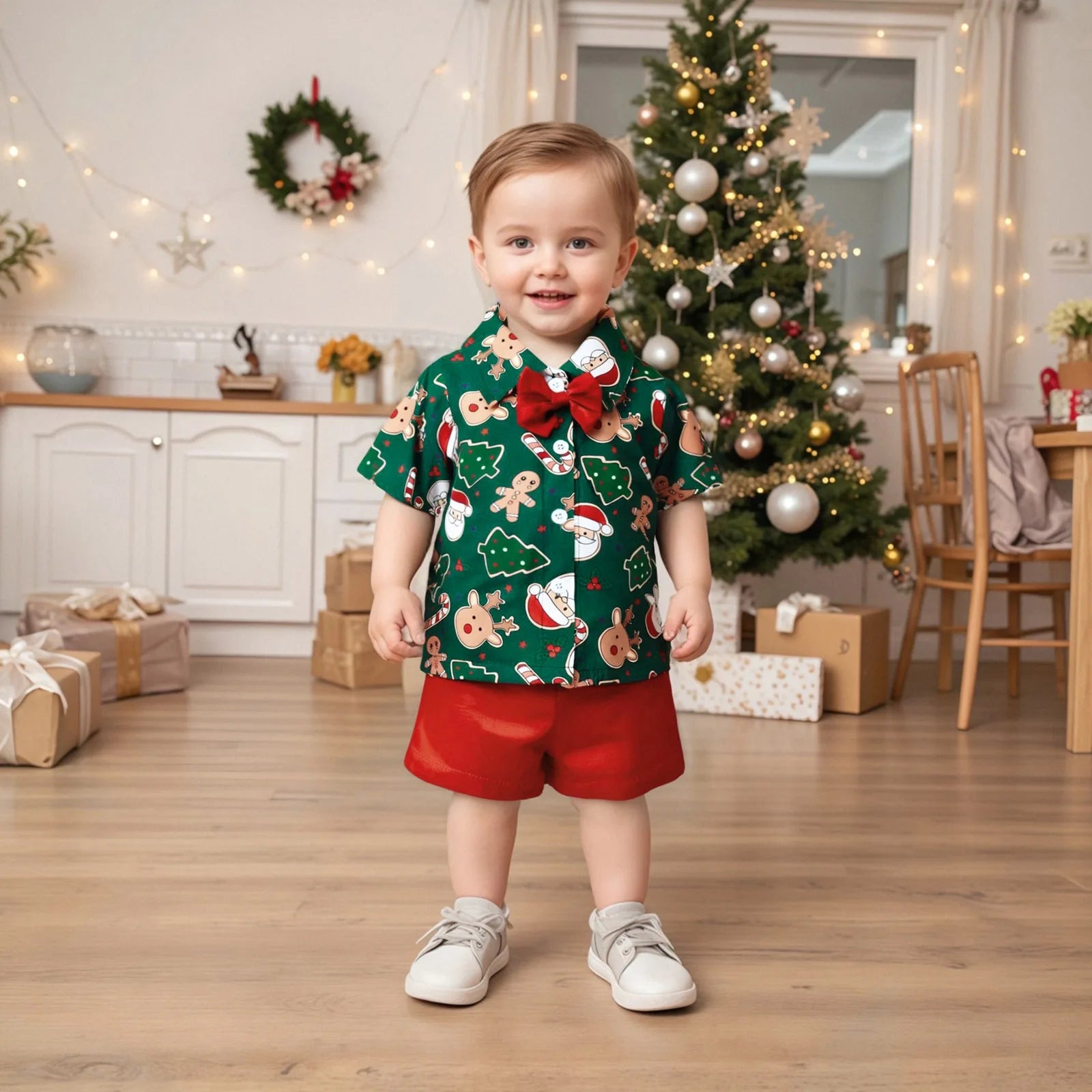 Gingerbread Cheer Christmas Set – Red Top + Green Shorts + Green Bowtie