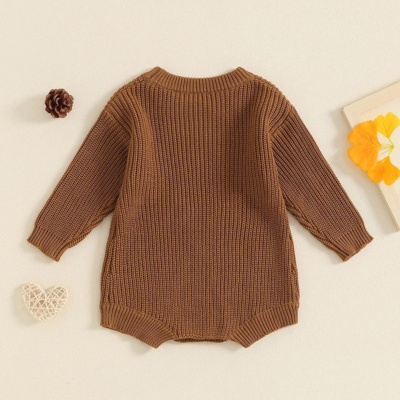 Wrap your little one in cosy comfort with our Little Cousin Knit Romper – a soft, long-sleeved baby romper designed for both baby boys and baby girls. Crafted in a warm chocolate brown knit, it features white embroidery that reads “little cousin” alongside tiny heart details – making it the perfect outfit for newborn family introductions, special photos, or just everyday cuteness.