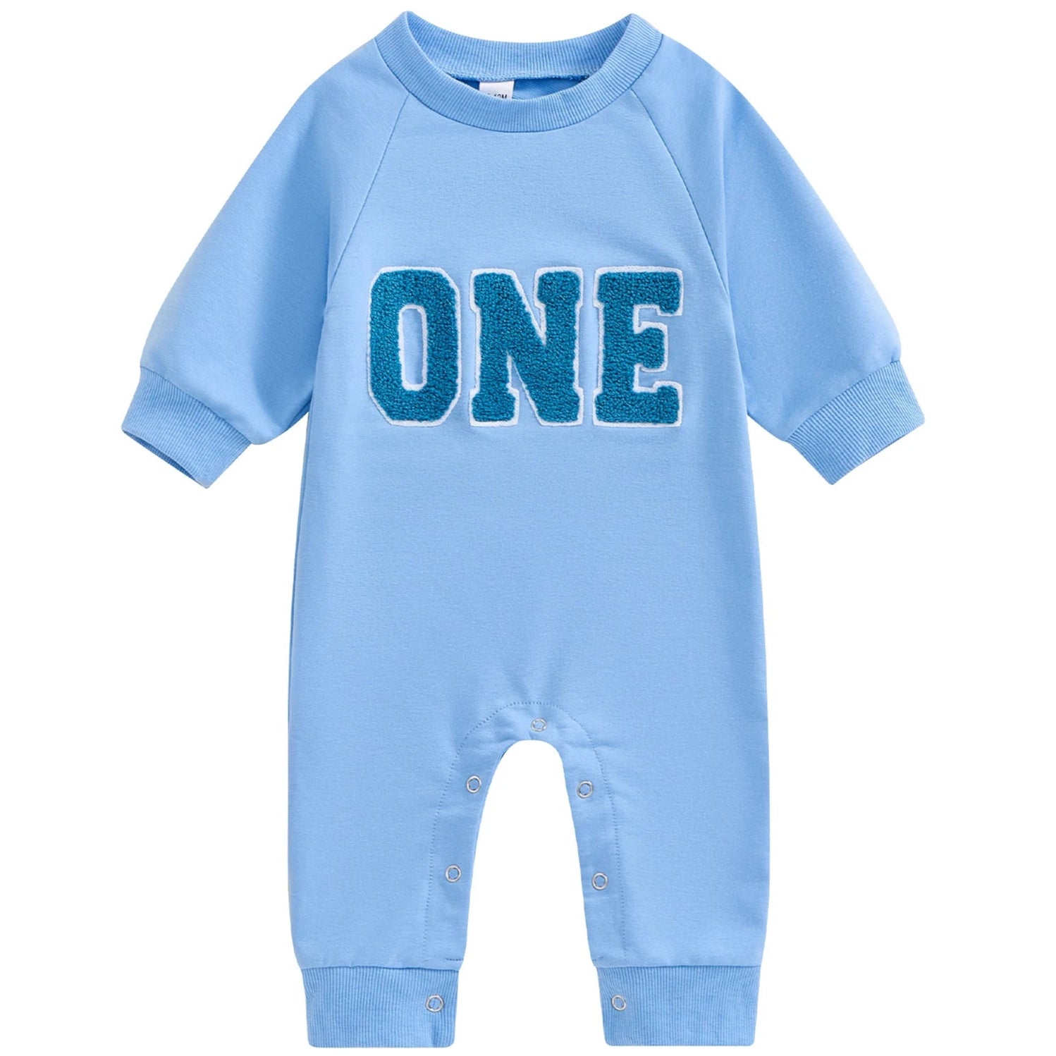 Make his first birthday unforgettable with this cosy blue fleece baby jumpsuit embroidered with fluffy blue “ONE” letters. Soft, breathable, and warm, this full-length romper keeps your little guy comfy and camera-ready on his special day.
