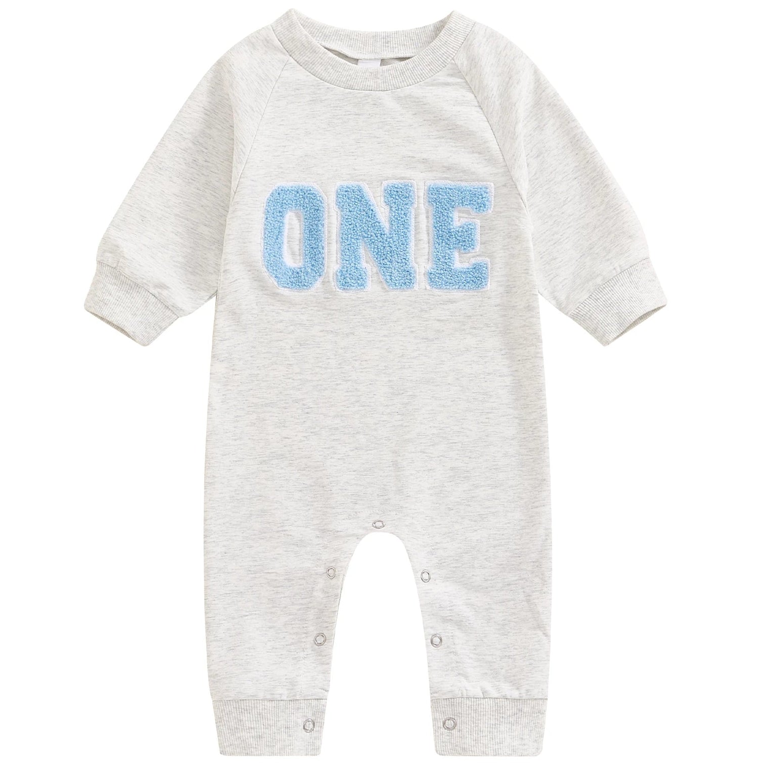 Celebrate his special day in classic style with this grey fleece baby birthday romper featuring soft, fluffy blue “ONE” letters on the front. Made from warm cotton terry and designed with long sleeves, full-length legs, and snap clips for easy dressing, it’s both practical and picture-perfect.
