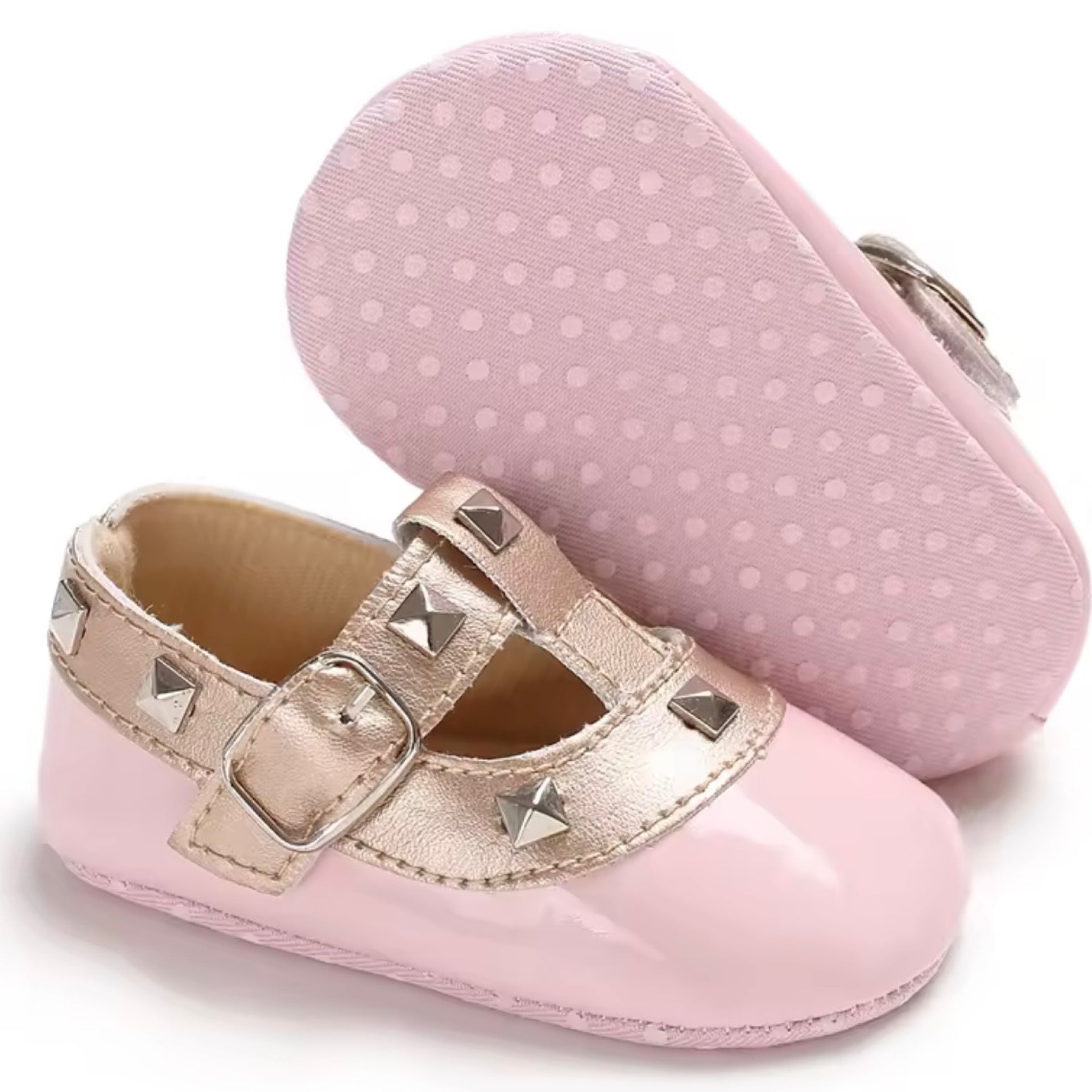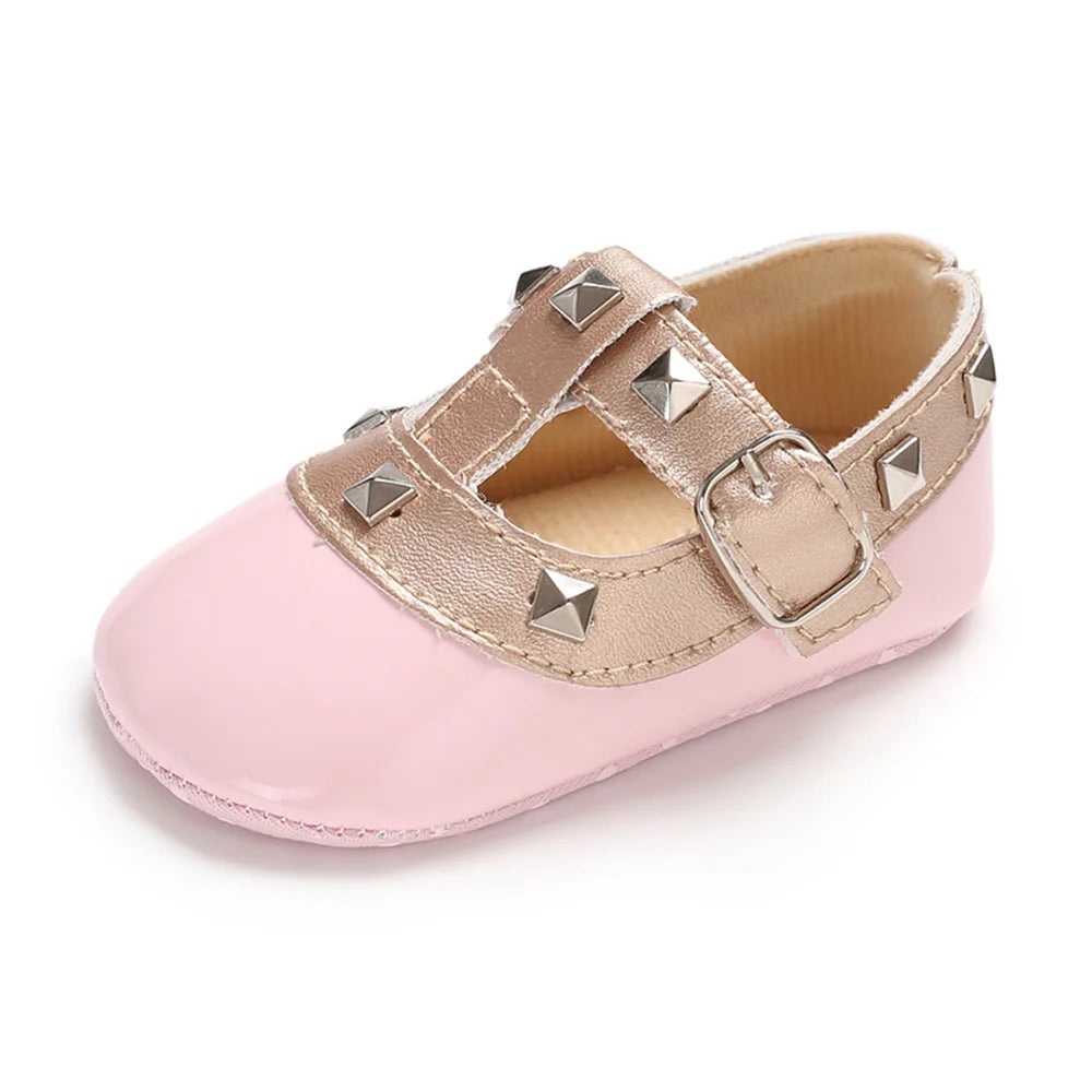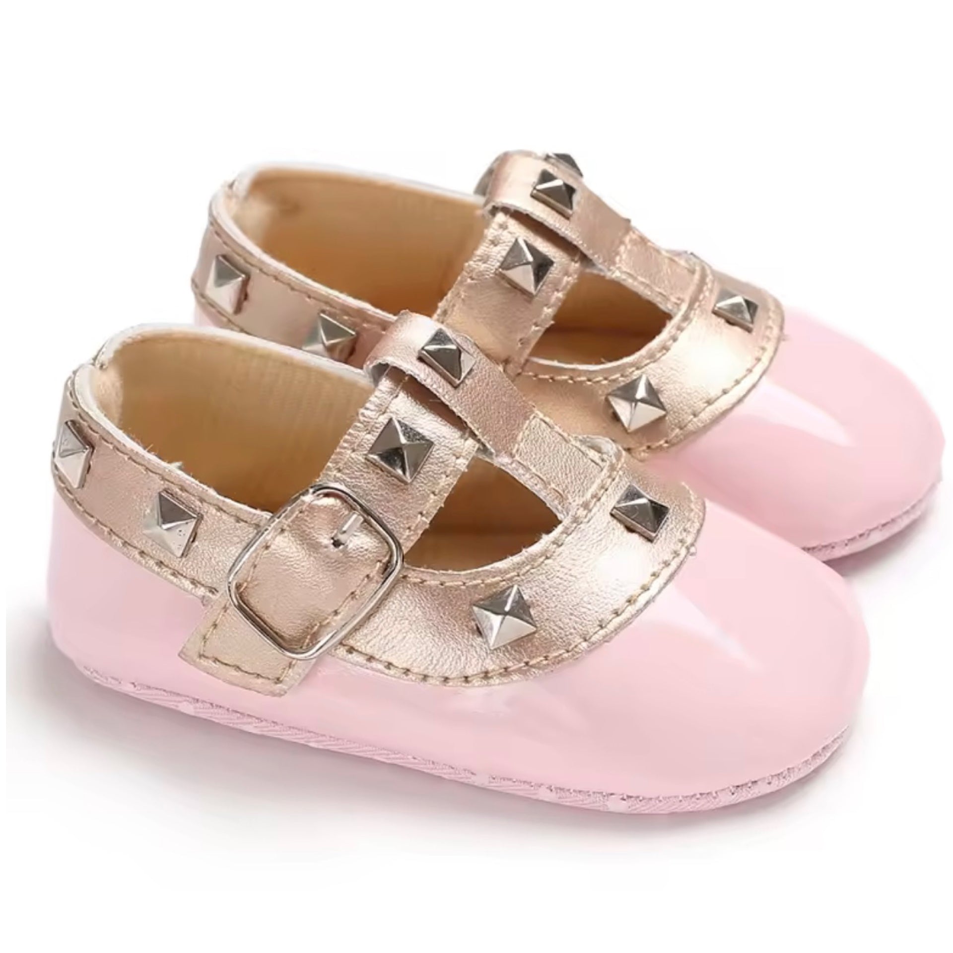 The Valentina Soft Sole Baby Shoes – Pink & Gold are a sweet and stylish option for little feet, combining soft structure with elegant detailing. Featuring a soft pink PU upper paired with metallic gold straps and stud accents, these shoes are designed for pre-walkers who need comfort, flexibility, and gentle support.