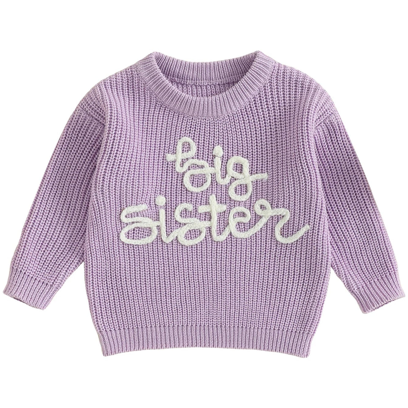 Rich purple knit with white “Big Sister” stitching