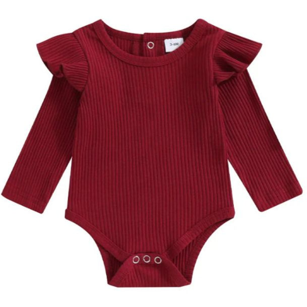 Rich and warm in tone, this red ribbed baby romper with flutter sleeves is perfect for layering through autumn or styling on its own in warmer months. Crafted from a stretchy cotton blend, it’s comfy, cute, and always photo-ready.