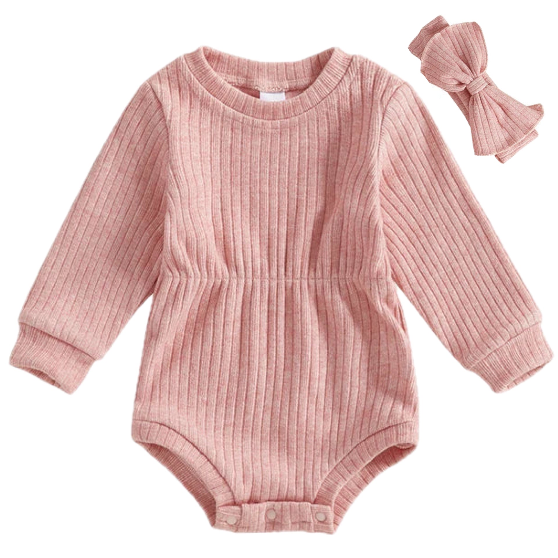 Soft Pink Ribbed Baby Girl Romper Set – Long Sleeve with Matching Bow | Little Eedie