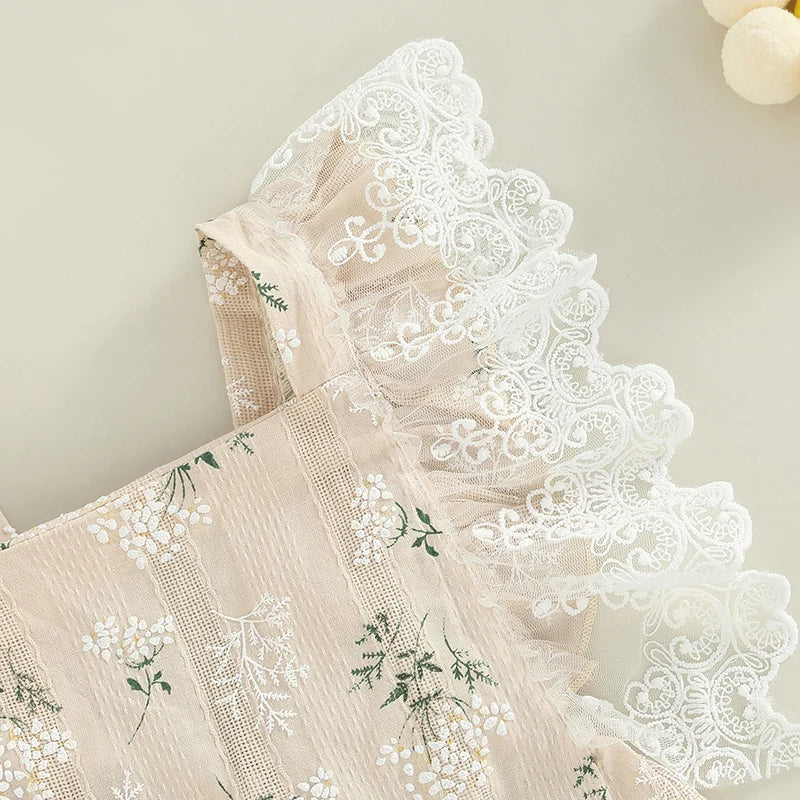 Cream Floral Romper with Lace Flutter Sleeves