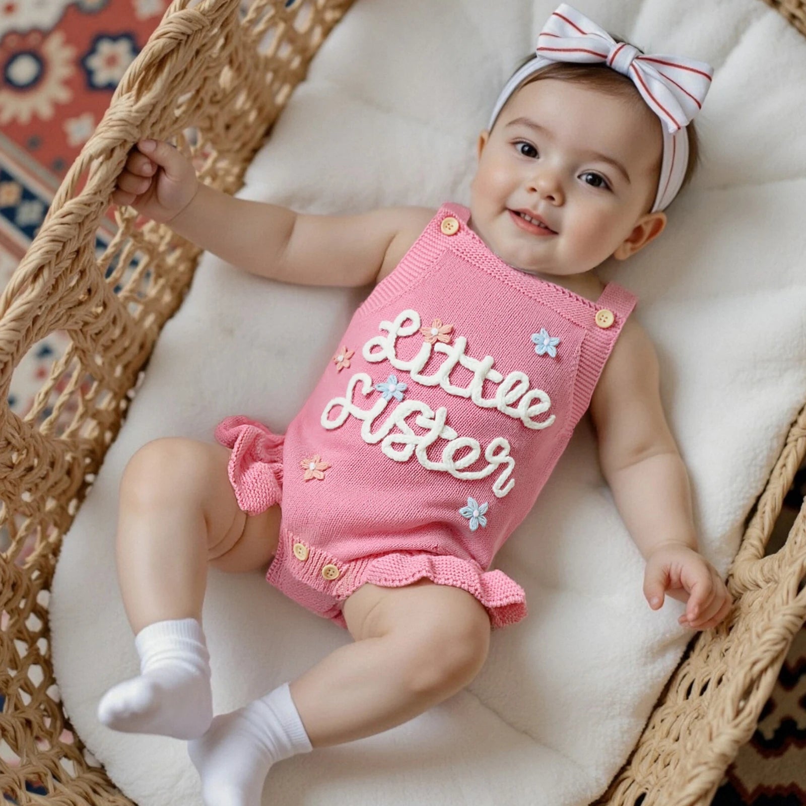 Celebrate your little one with our Pink “Little Sister” Knit Romper, a heartwarming baby girl outfit made for special memories. This romper features adorable ruffle sleeves, delicate knit leg frills, and an embroidered “Little Sister” script across the front. Crafted in a warm baby pink tone, the romper includes three faux wooden buttons and adjustable buttoned straps for easy wear and adorable styling. Designed for newborn photoshoots, family introductions, or sibling announcements, it’s soft, stretchy, and perfect for layering in all seasons.
