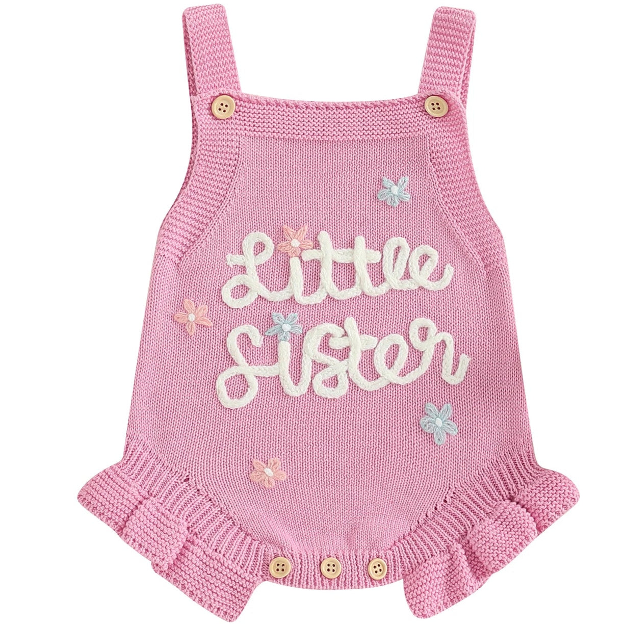 Pink “Little Sister” Knit Romper with Ruffle Sleeves – Baby Girl Outfit