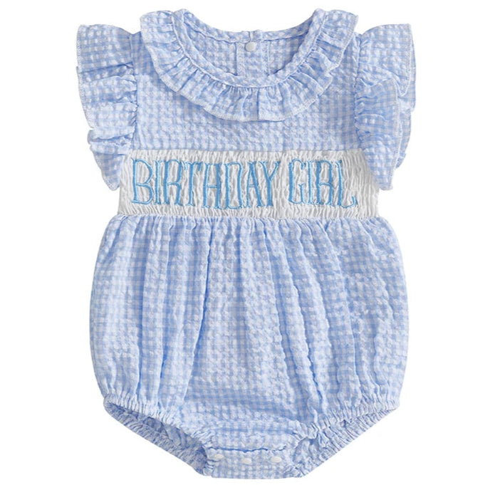 Mark the milestone with charm in our Blue & White Check Birthday Romper for baby girls. Featuring the same vintage gingham appeal with soft elastic rouching and dainty frill sleeves, this romper is embroidered with "Birthday Girl" in elegant white stitching. The structured collar adds a polished touch, perfect for birthday parties and keepsake photos.
