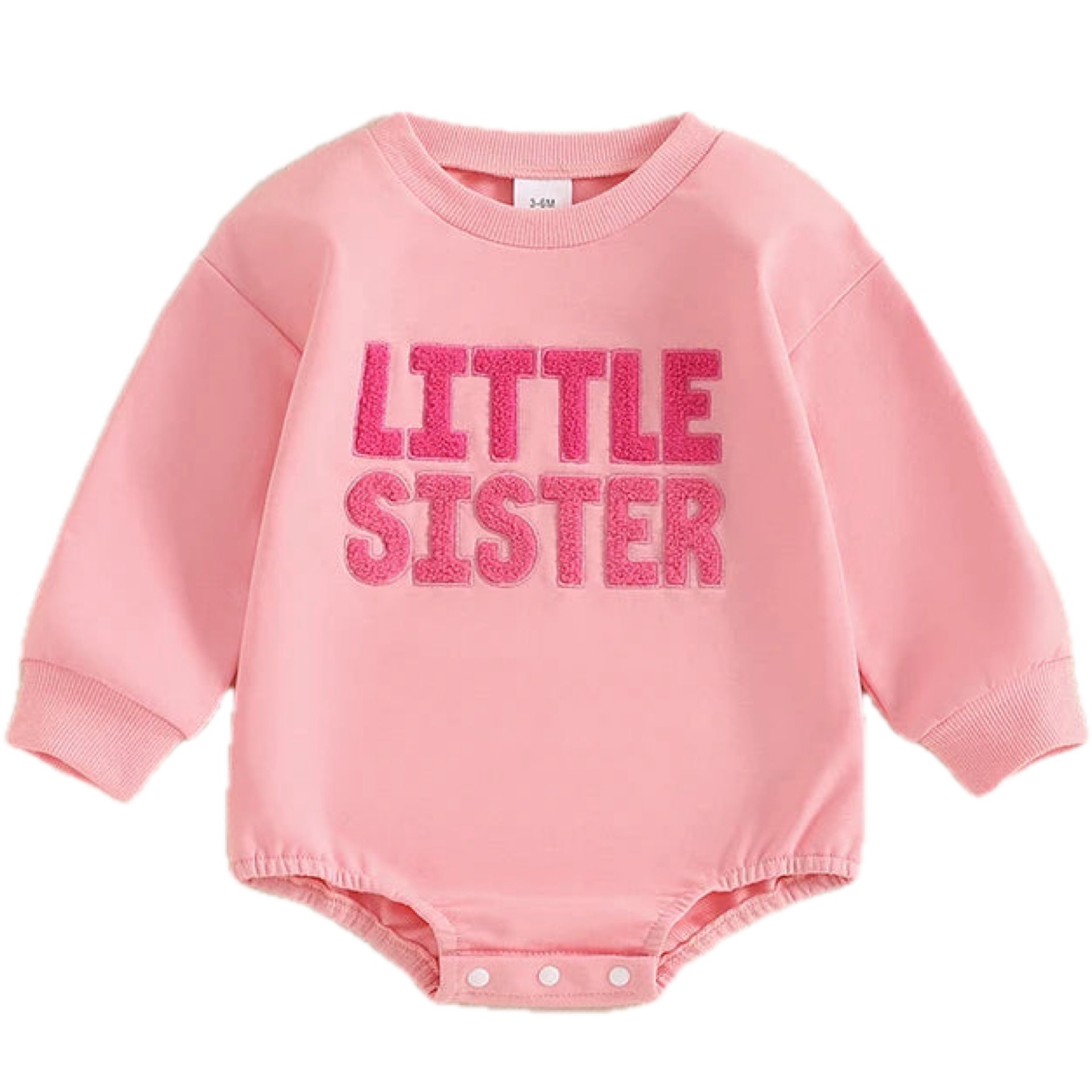 Pink long sleeve baby romper with fuzzy “Little Sister” embroidery