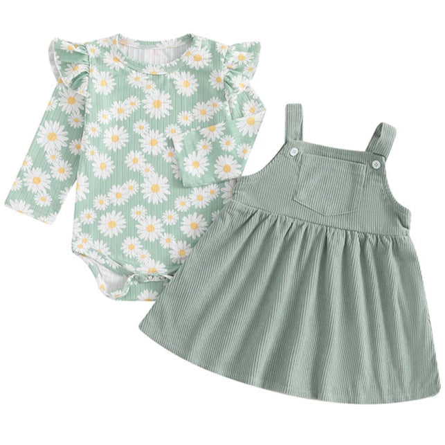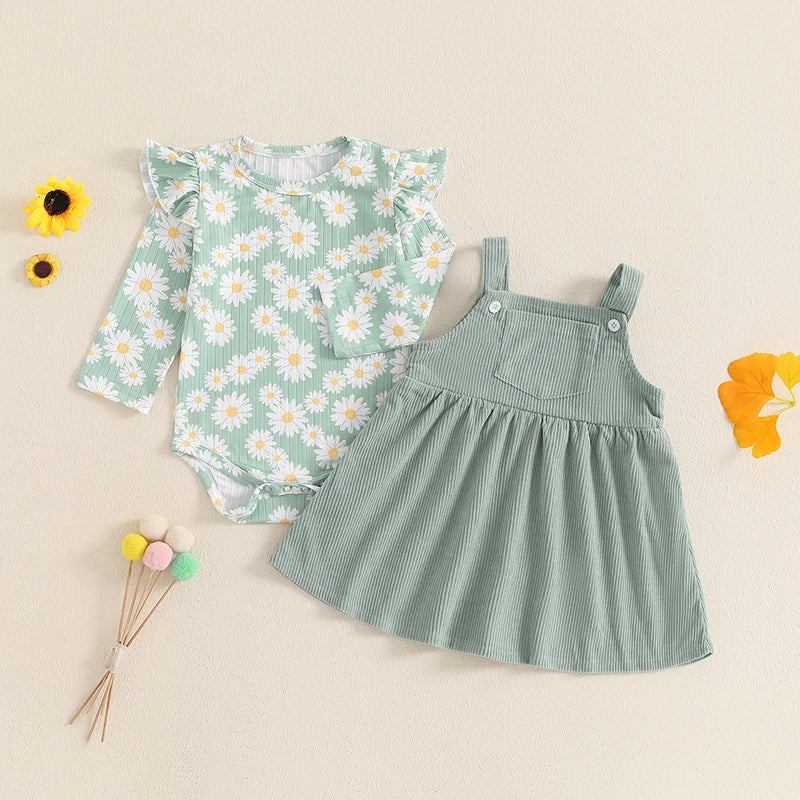 Our Green Daisy Pinafore Dress Set is made for little adventurers with a love for nature. It includes a light sage-green corduroy pinafore with delicate white buttons, a mini front pocket, and elegant criss-cross tie straps. Underneath is a soft, stretch ribbed romper with dainty flutter sleeves and a charming white daisy print.