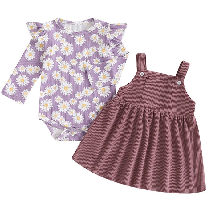 Dress your little love in soft elegance with this Mauve Daisy Pinafore Set. This warm-toned purple corduroy dress features cross-over back straps, functional buttons and a sweet pocket for added charm. Underneath, a flutter-sleeve ribbed romper with playful white daisies completes the look.