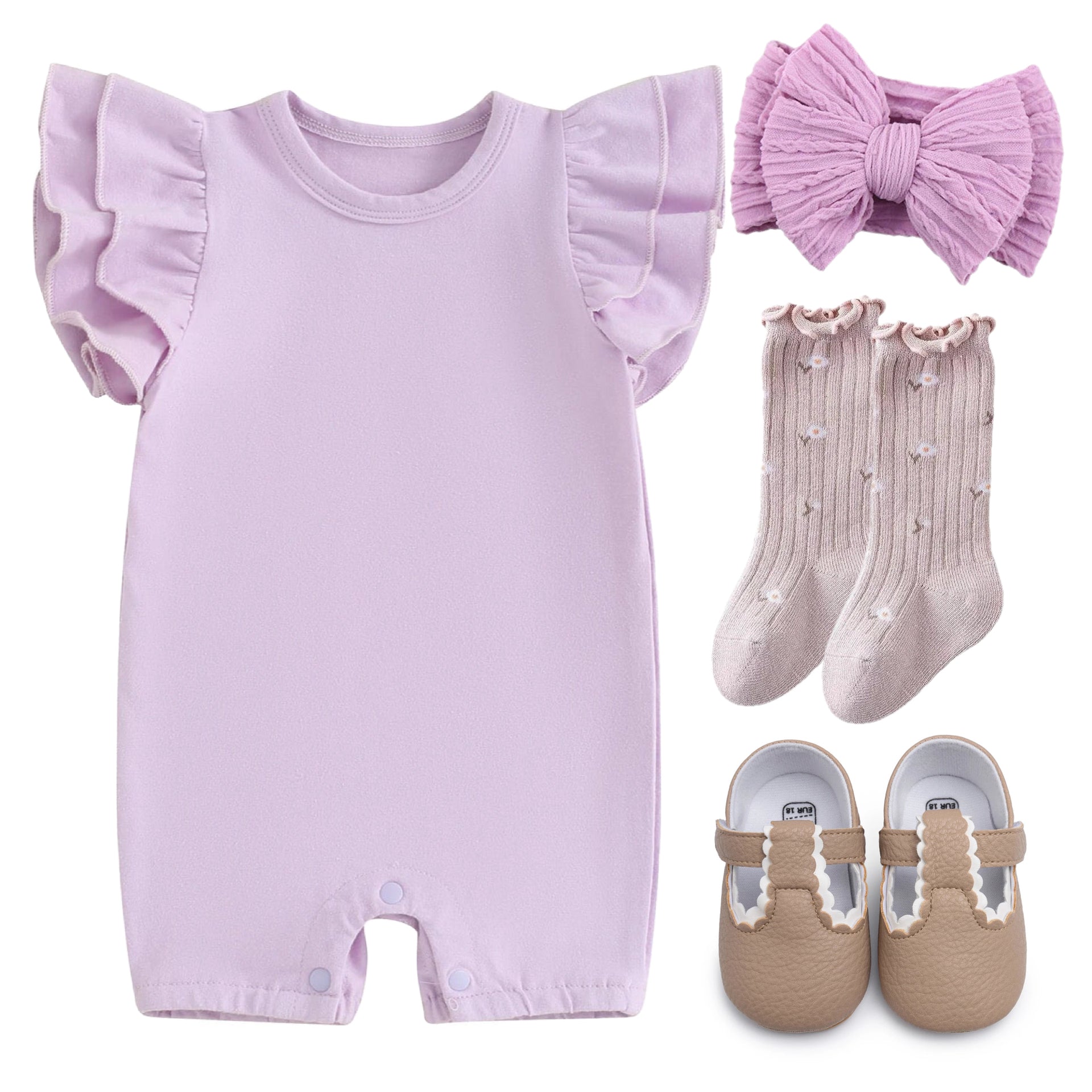 Little Eedie Purple Baby Girl Outfit Value Bundle – Romper, Socks & Headband Set + Beige T-Bar Shoes