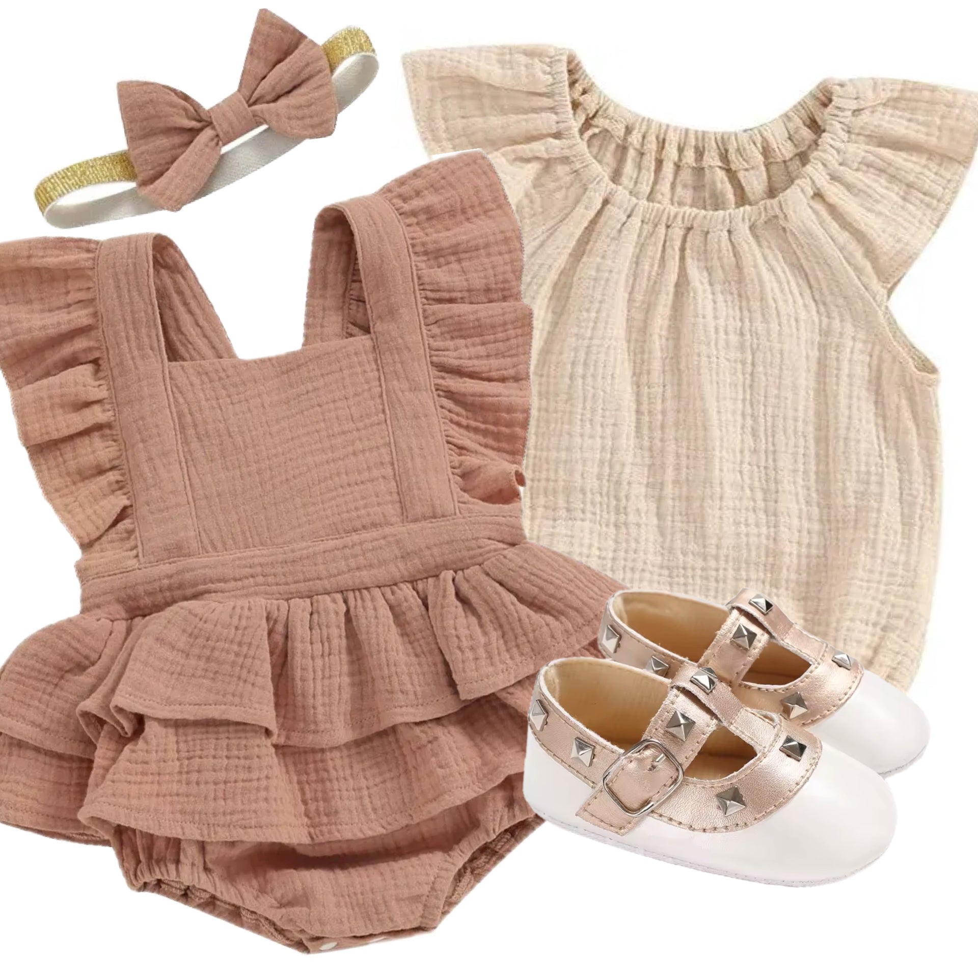 Create the perfect baby girl outfit with our Soft Neutrals Baby Girl Outfit Bundle, thoughtfully styled for comfort, versatility, and timeless wear. This bundle brings together two of our most-loved rompers with a matching pair of soft-sole baby shoes, making it ideal for everyday dressing, gifting, or effortless outfit planning.