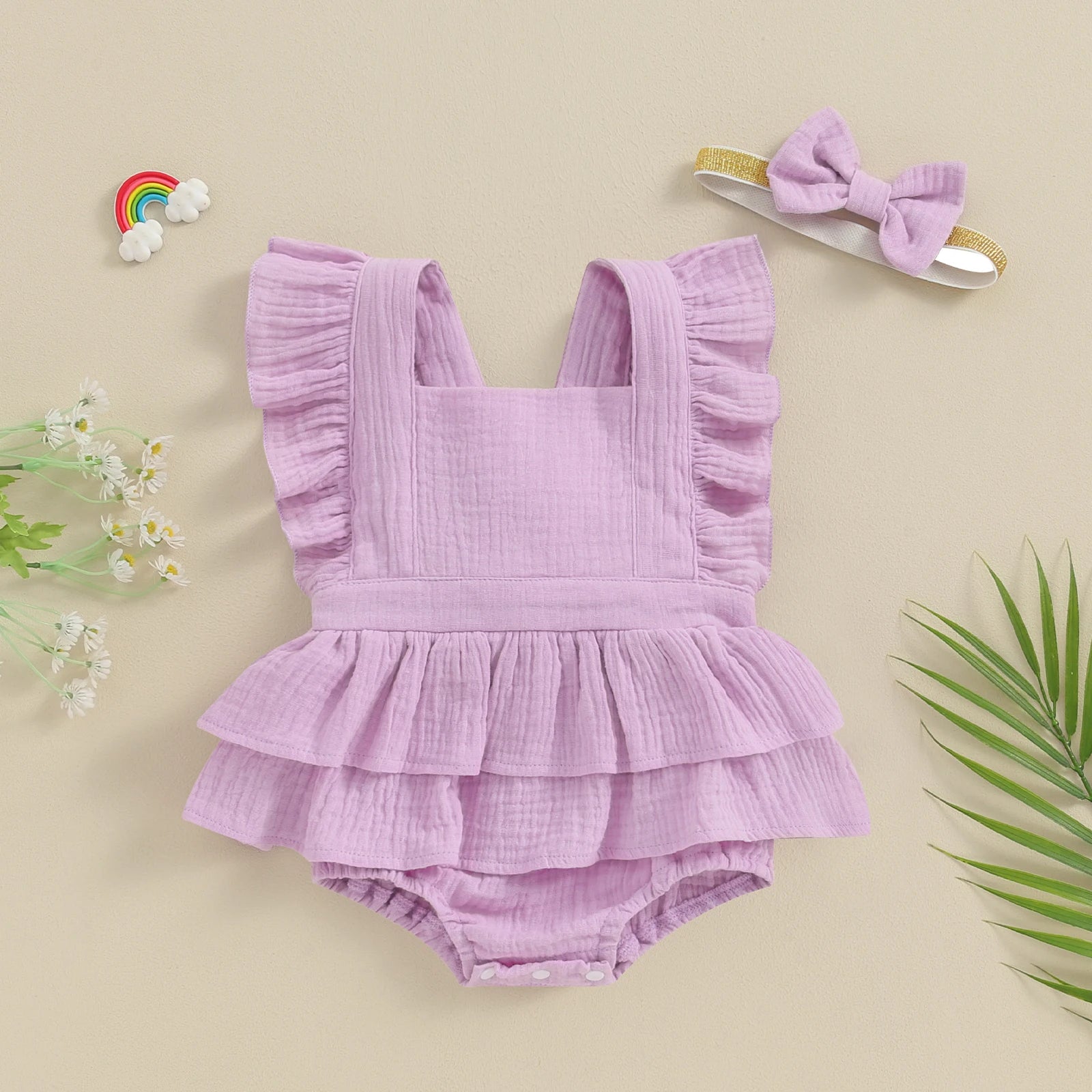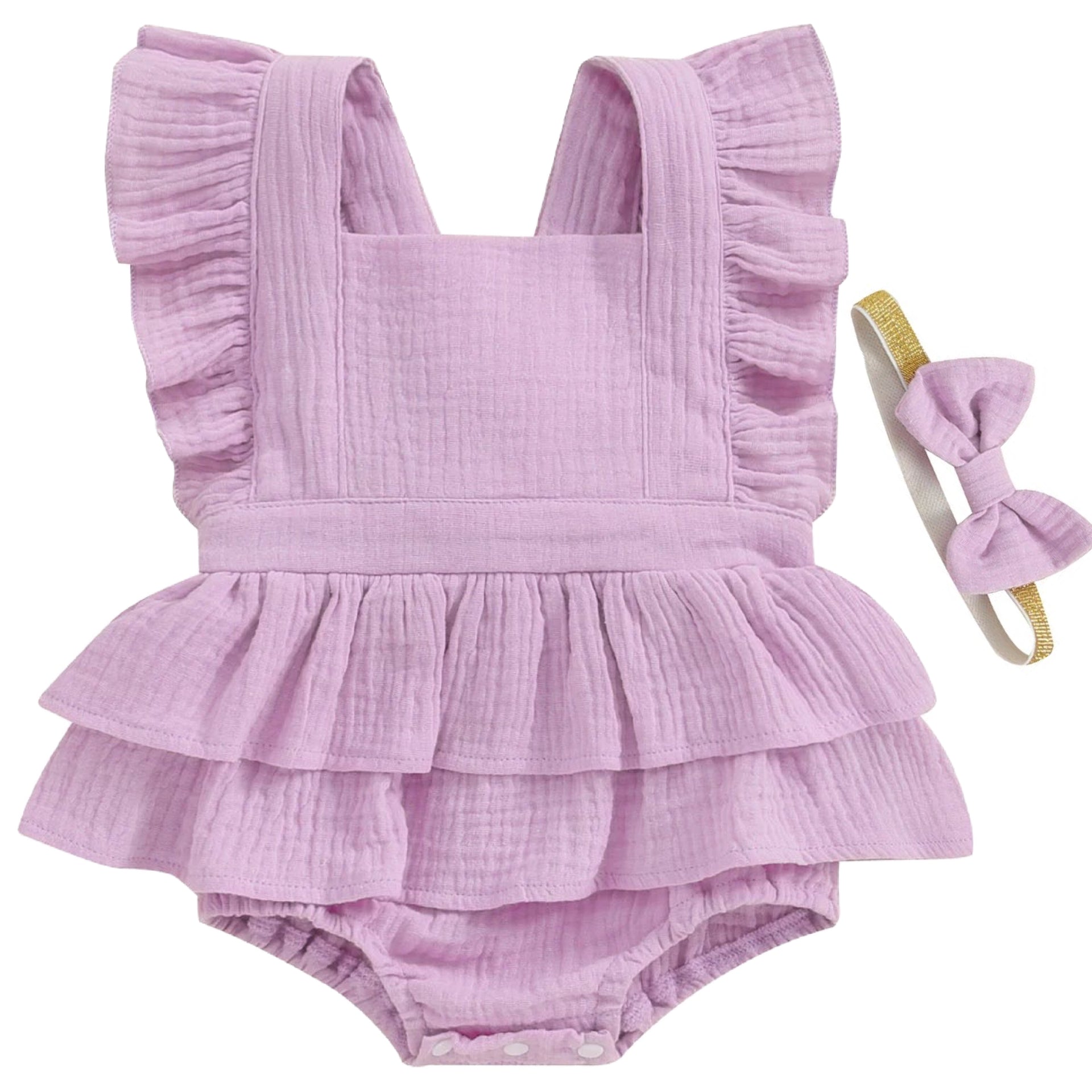 Soft, delicate, and dreamy — this Lilac Baby Girl Romper is perfect for milestone moments and everyday adventures. The breathable cotton blend keeps baby cool and cozy, while fluttery peplum ruffles and a tie-up back add the sweetest finishing touch. Snap-button closures make changing easy, so you can spend more time making memories.