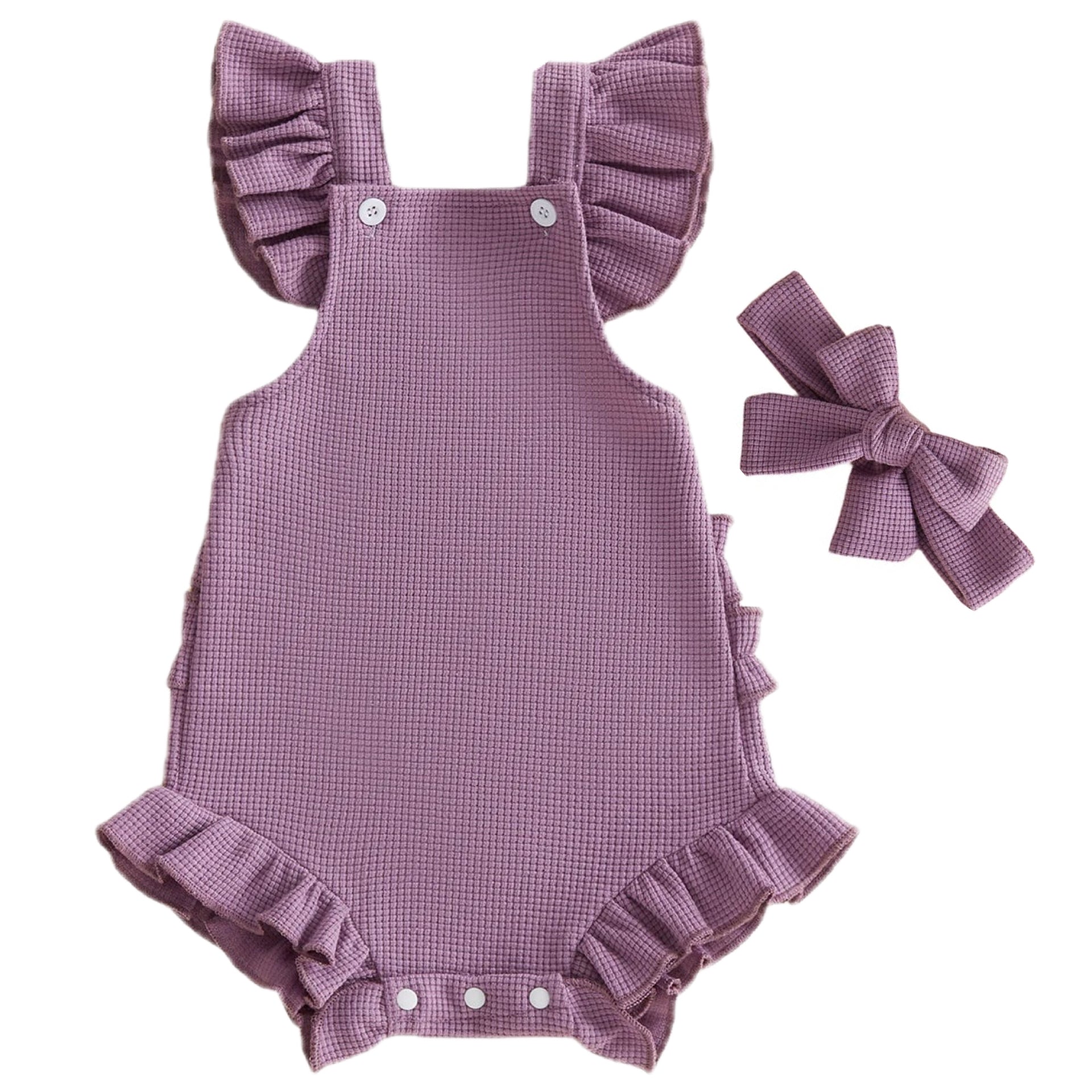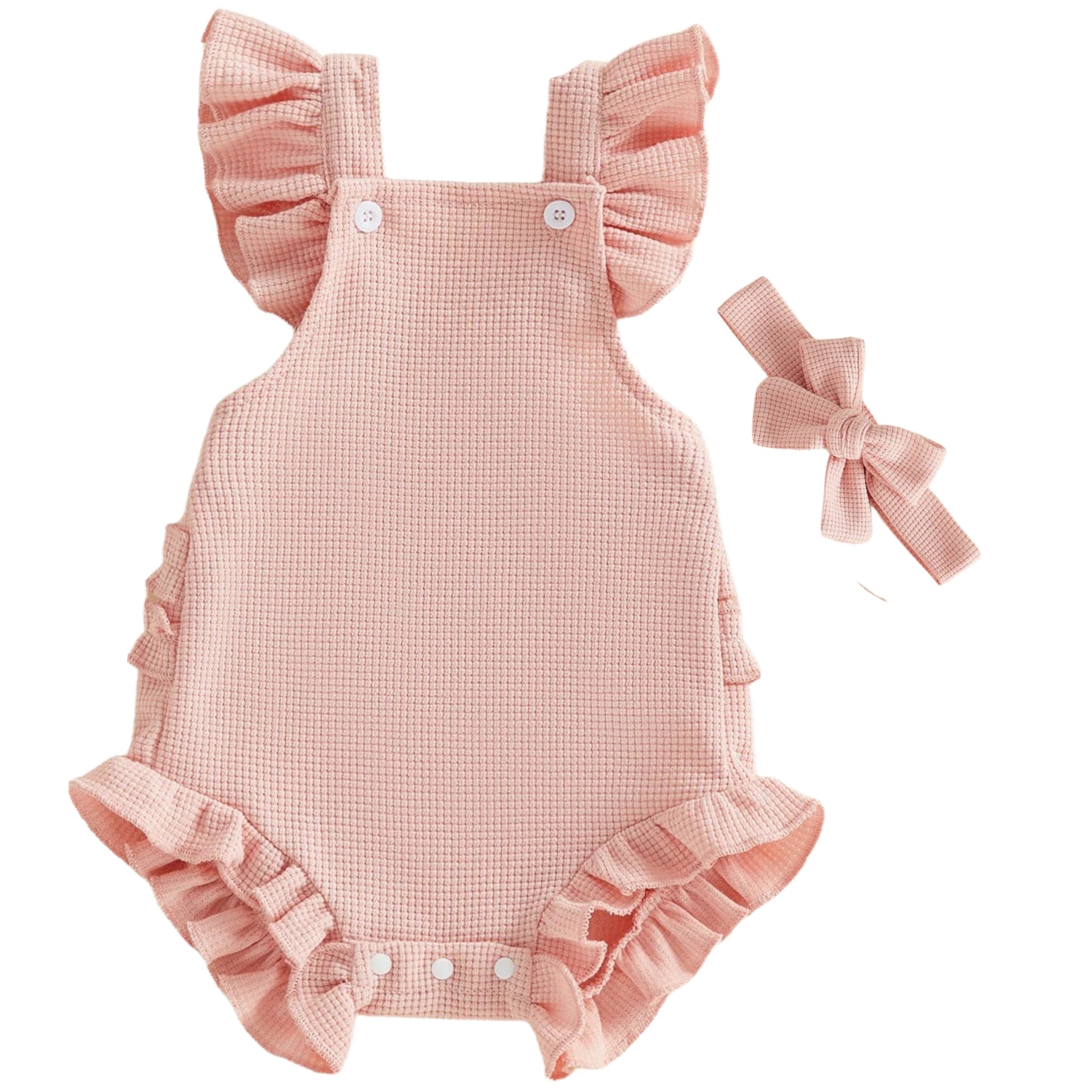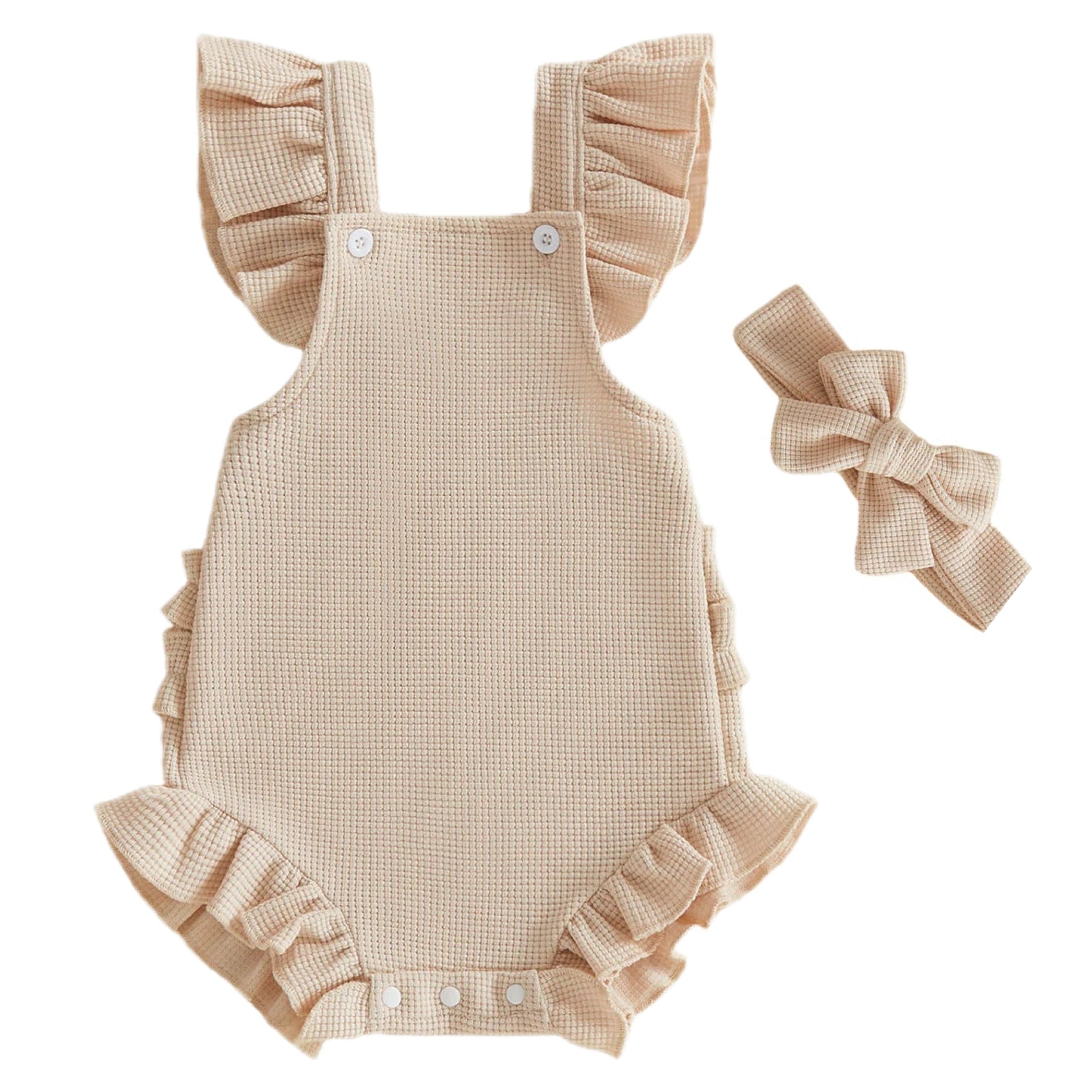 Made from a soft waffle-textured fabric, this romper features sweet shoulder ruffles, ruffle leg detailing, and convenient snap clips for easy nappy changes. Each set includes a matching bow headband, making it perfect for daily wear, milestone photos, or gifting.