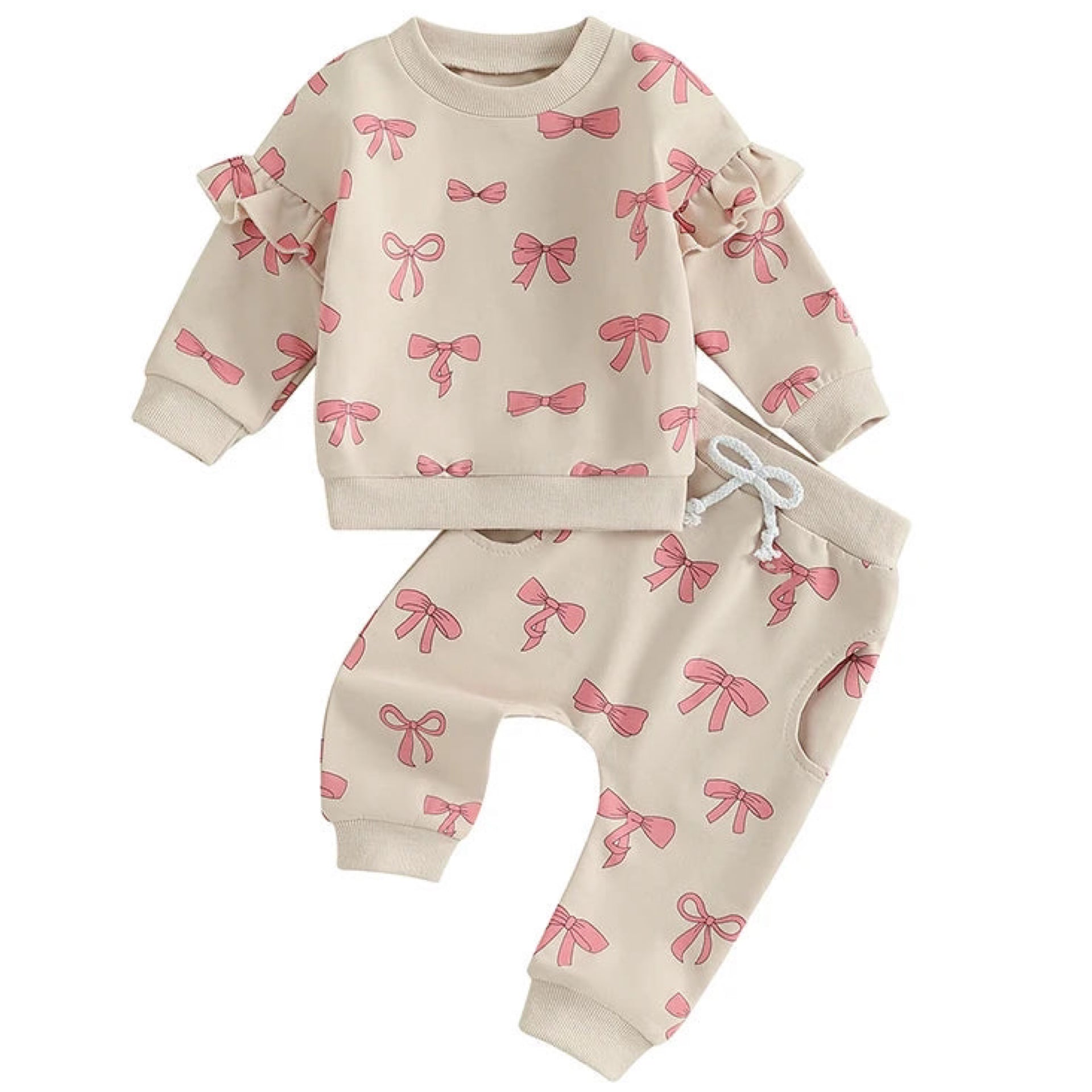 Baby Girl Tracksuit – Cream Ruffle Sleeve Set with Pink Bows