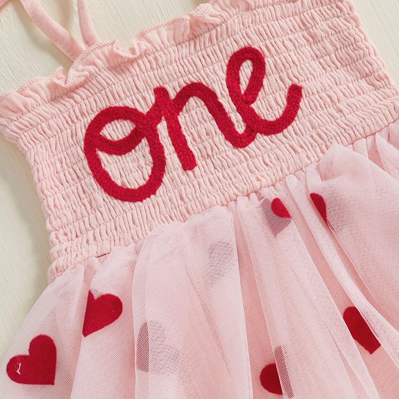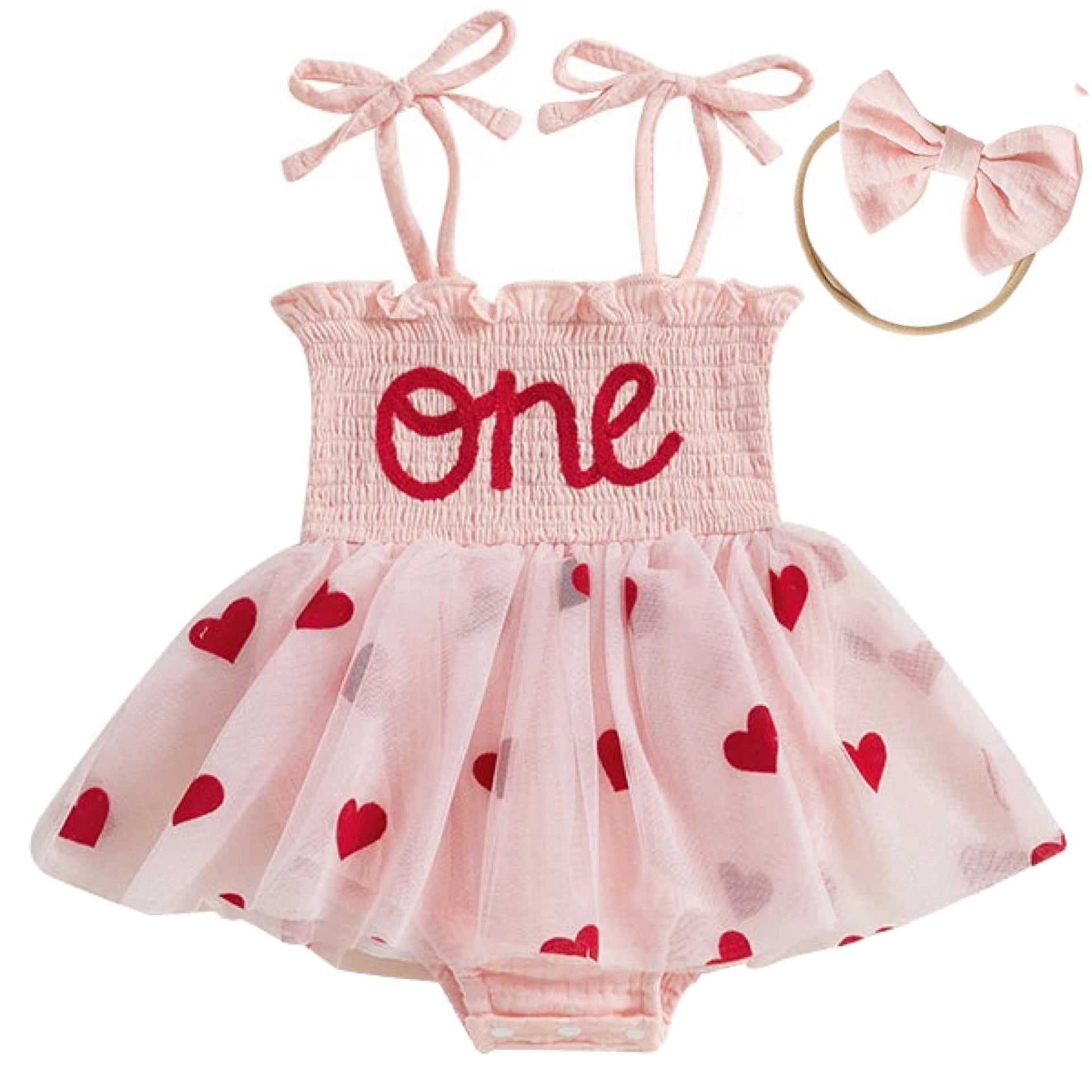 The stretchy shirred bodice provides a comfortable, secure fit, while the tie-up shoulder bows add adjustability and a delicate boutique look. The layered tulle skirt features scattered red heart prints that flutter with movement - perfect for photos and all her birthday fun. Underneath, the romper includes built-in bottoms with snap clips for easy changing.