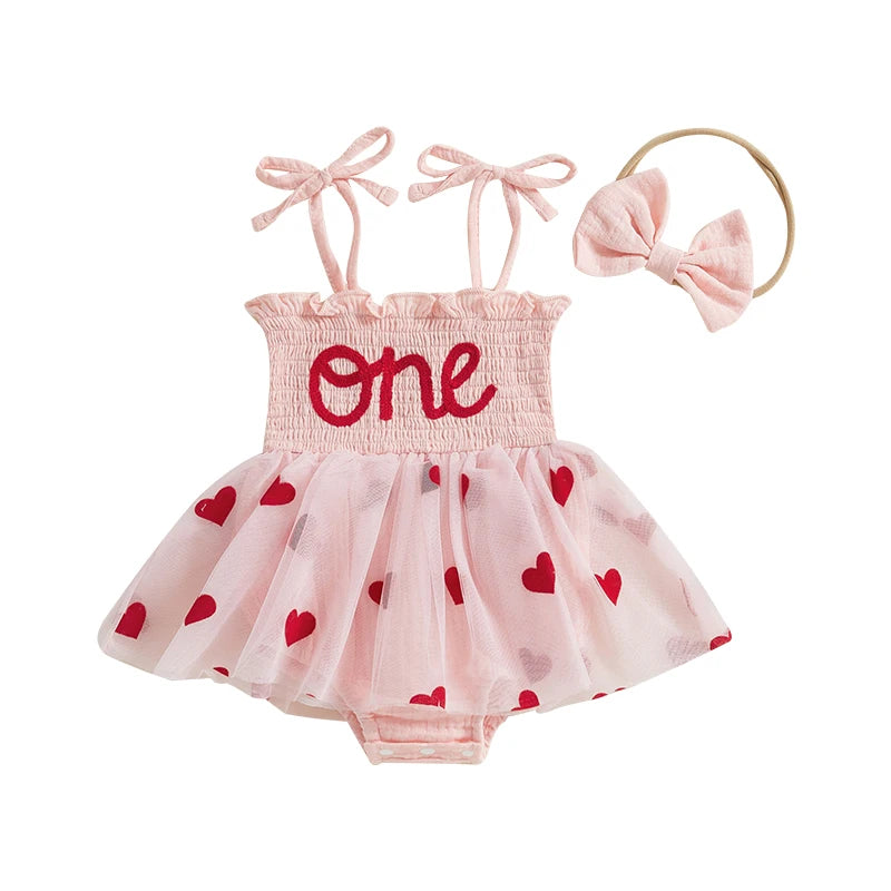 Baby Girl “One” Heart Tutu Birthday Romper - Pink (with Matching Bow Headband)