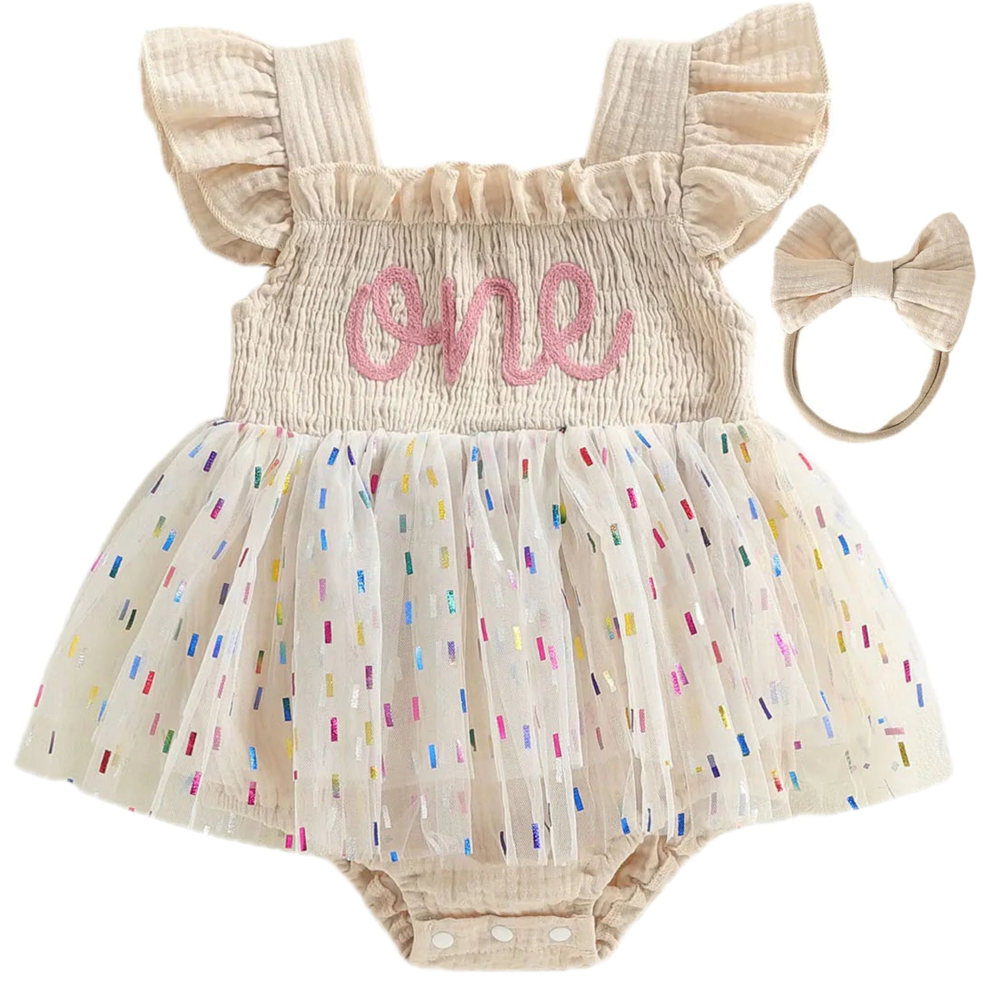 This beautiful romper dress features a soft smocked bodice embroidered with “one”, flutter sleeves, and a lightweight tulle skirt scattered with subtle rainbow accents that catch the light without overpowering the look. The cream colourway creates a classic, refined aesthetic-perfect for first birthdays, cake smash photos, christenings, or special family celebrations.
