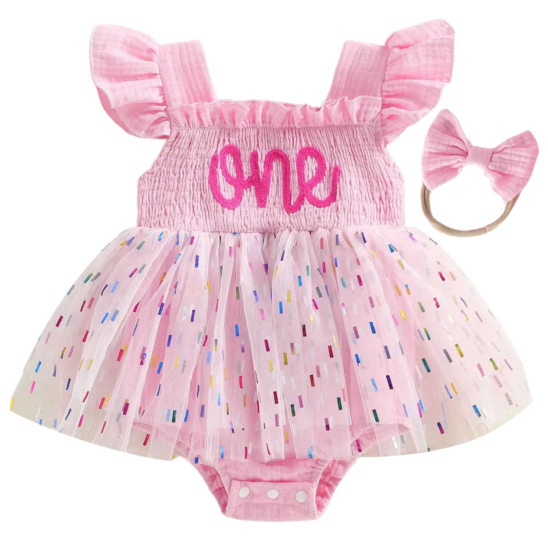 The romper features a smocked bodice with embroidered “one” lettering, delicate flutter sleeves, and a dreamy tulle skirt finished with playful rainbow accents. The soft pink colourway adds a traditional birthday feel that parents love for cake smashes, milestone photos, and special celebrations.