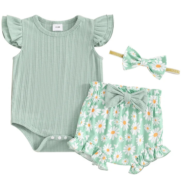 Belle Baby Ribbed Romper Daisy Set – Green