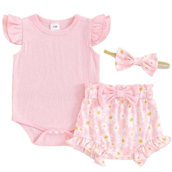 Sweeten up your baby's wardrobe with the Belle Baby Ribbed Romper Daisy Set in Pink. Featuring a ribbed cotton romper with darling flutter sleeves and soft snap clips for quick changes, this outfit is both practical and precious. The daisy print shorts add a fun and playful flair, while the matching bow headband completes the picture-perfect look.