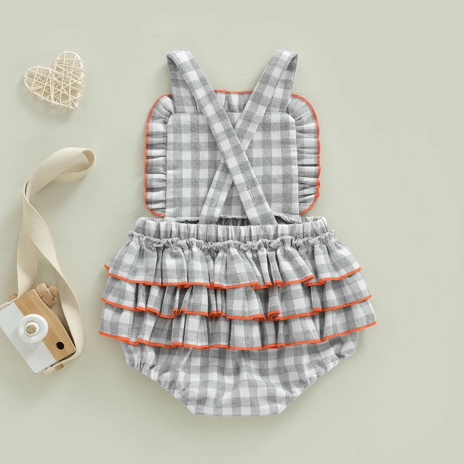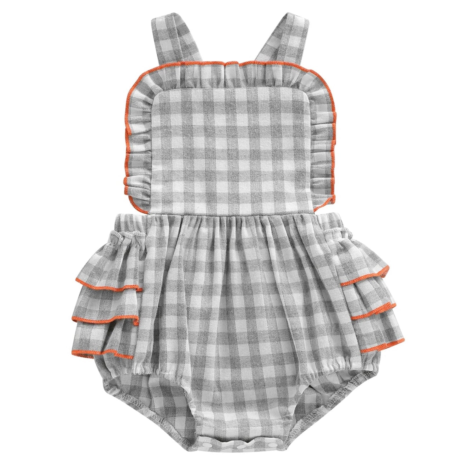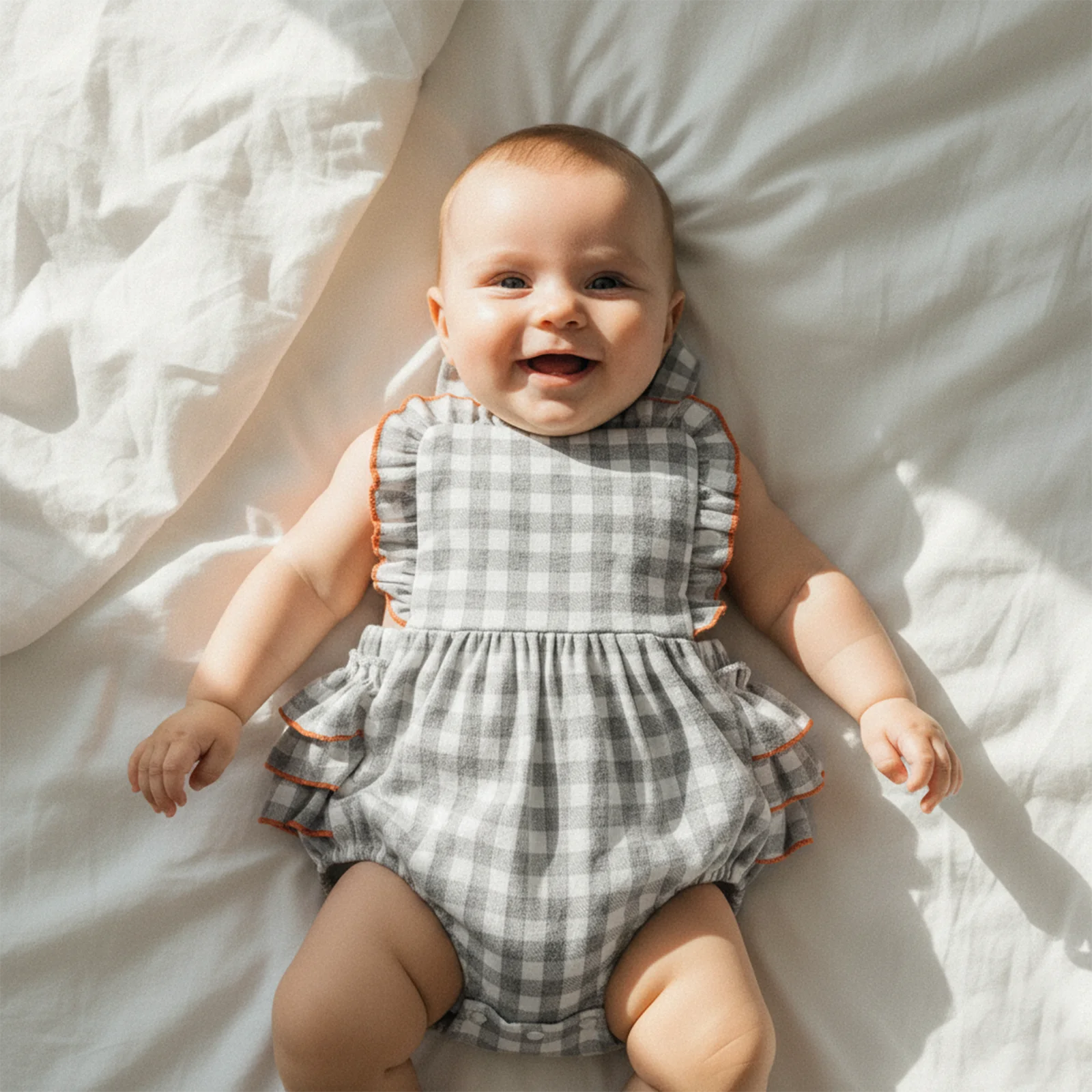 Soft, neutral, and easy to style, the Gingham Ruffle Baby Girl Romper in Grey & White is a beautiful everyday outfit designed with comfort in mind. Crafted from a breathable cotton blend with added stretch, this romper features a subtle grey and white gingham print with layered ruffle detailing for a sweet, classic finish.