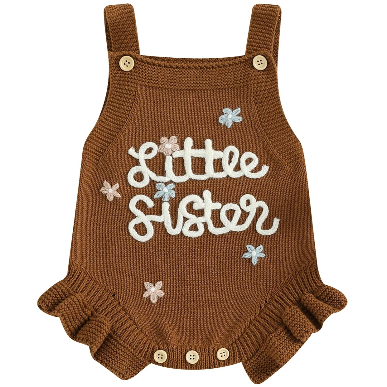 Neutral and warm, our Brown “Little Sister” Knit Romper is the perfect sibling outfit with a modern twist. The warm caramel-brown knit, paired with white embroidery and ruffle detailing, makes this outfit stylish and grounded. It's ideal for baby girls who are part of a boho or earthy-toned nursery theme.
