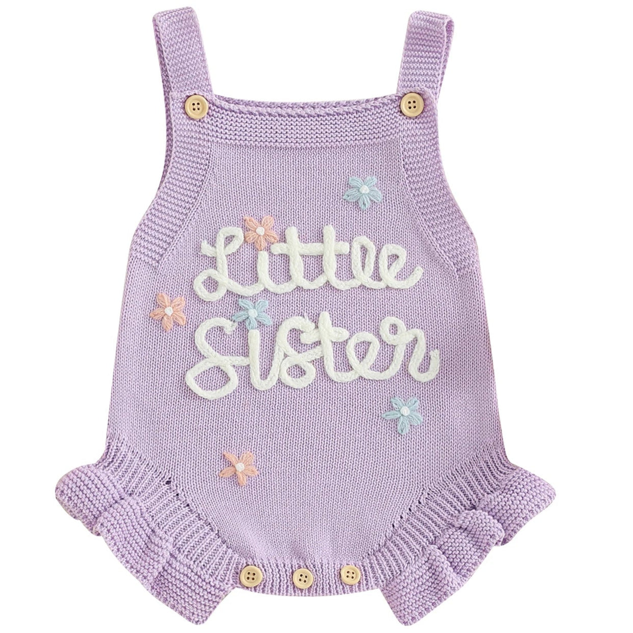 Say hello to your newest arrival in our Lavender “Little Sister” Knit Romper. This pastel purple piece is perfect for announcing her to the world. With intricate leg frills, flutter sleeves, and white embroidered text, the romper is both meaningful and Instagram-ready. Designed with wooden-style buttons and adjustable straps, it offers comfort and charm from day one.