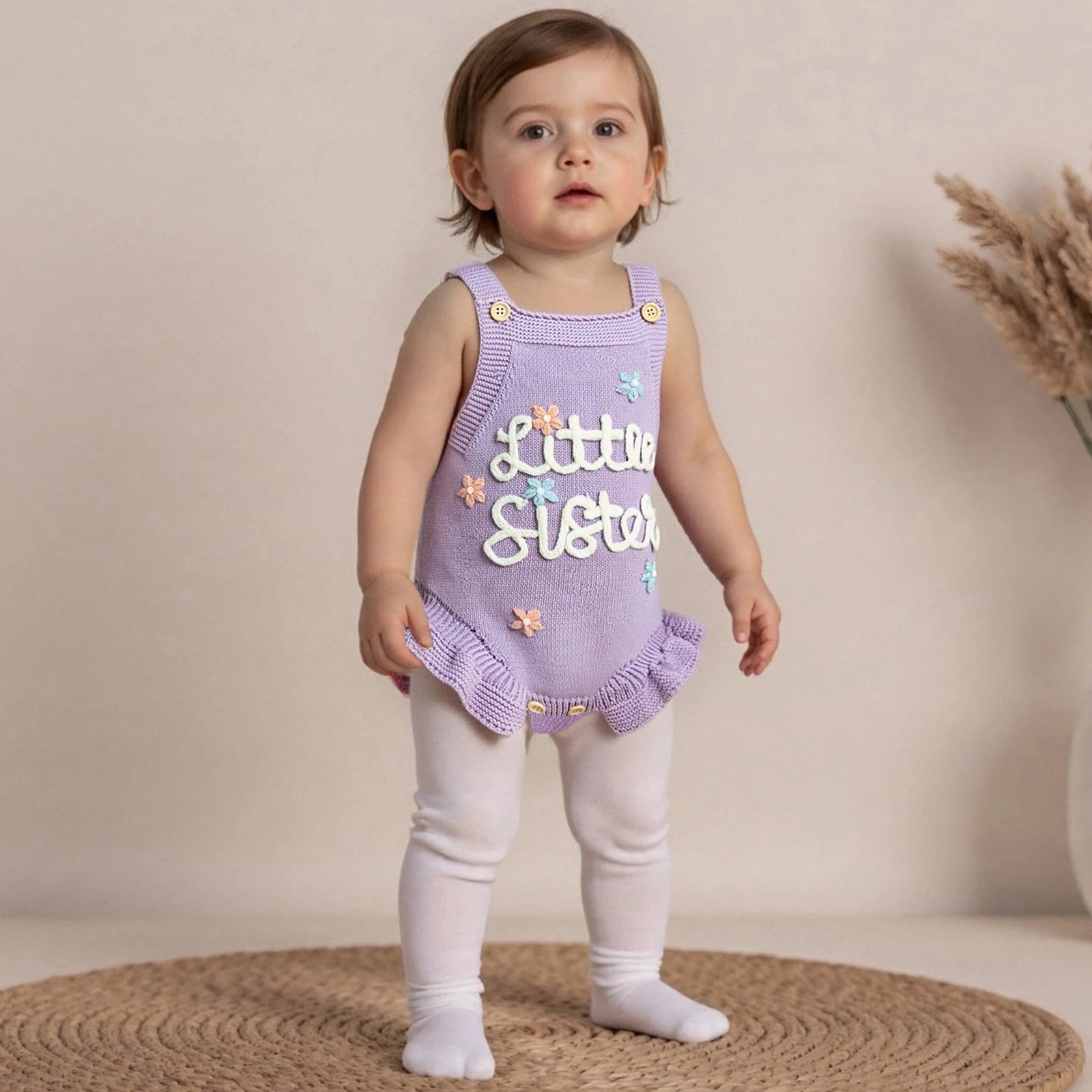 Lavender “Little Sister” Knit Romper – Soft Baby Girl Knitwear