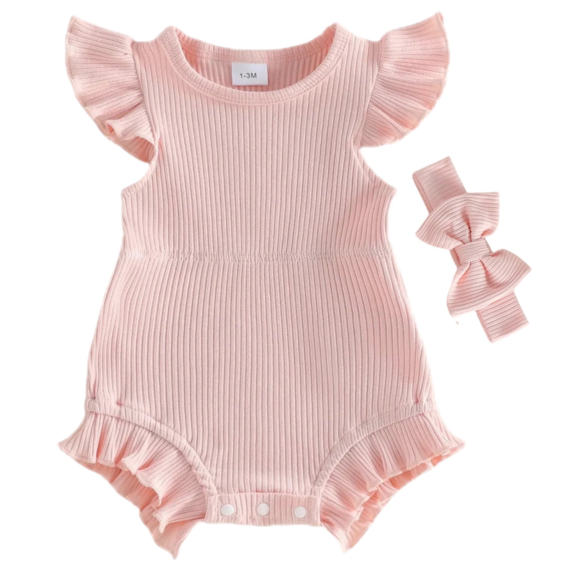 Made from ribbed cotton fabric, this romper features delicate flutter sleeves, a gently shaped fit, and soft stretch for easy movement. The classic pink tone adds a timeless touch, making it perfect for daily wear, outings, or special moments captured in photos. Finished with snap closures for quick nappy changes, it’s as practical as it is pretty.
