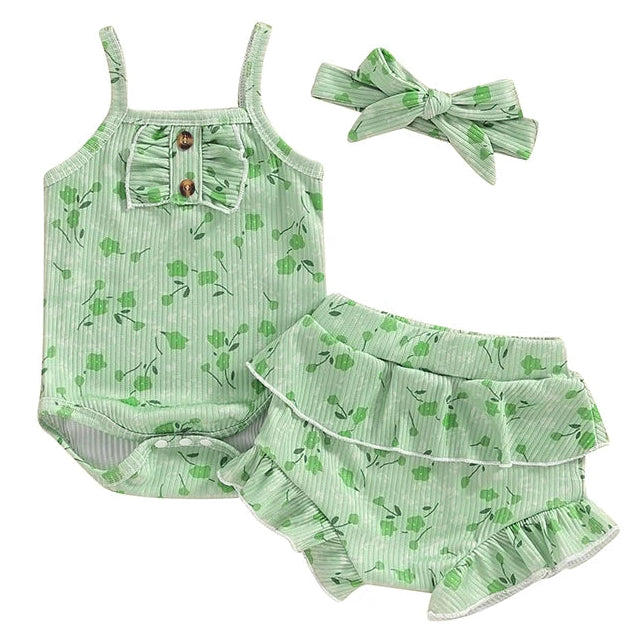 Turn heads in the Pippa Floral Baby Girl Set in Green, a stylish 3-piece outfit designed for little trendsetters. The set includes a dainty floral romper with ruffle detailing and faux buttons, complemented by frilly peplum shorts with stretch leg bands. Finished with a matching topknot headband, this lightweight set is ideal for warm-weather playdates, Christmas gatherings or sweet baby milestone photos.