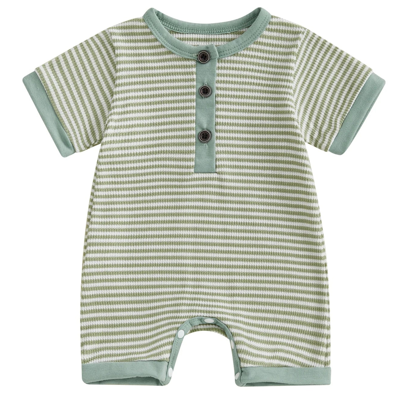 Brighten up your baby’s day with our Green Stripe Ribbed Cotton Baby Romper. This gender-neutral romper features a soft ribbed fabric in refreshing minty green tones. Designed for comfort and practicality, it includes snap buttons for stress-free changes and short sleeves for maximum breathability.