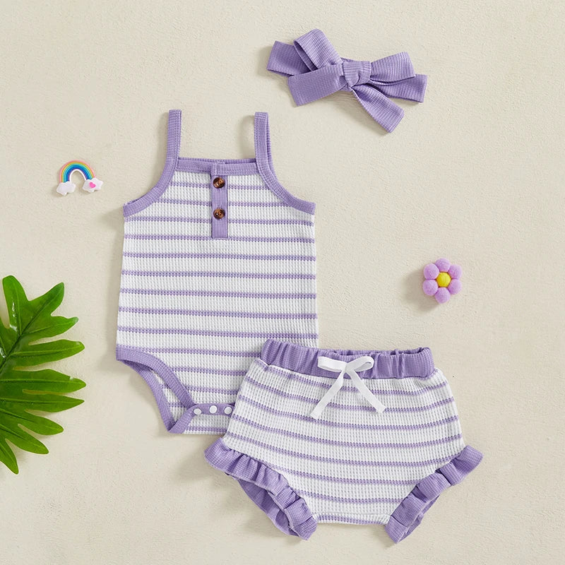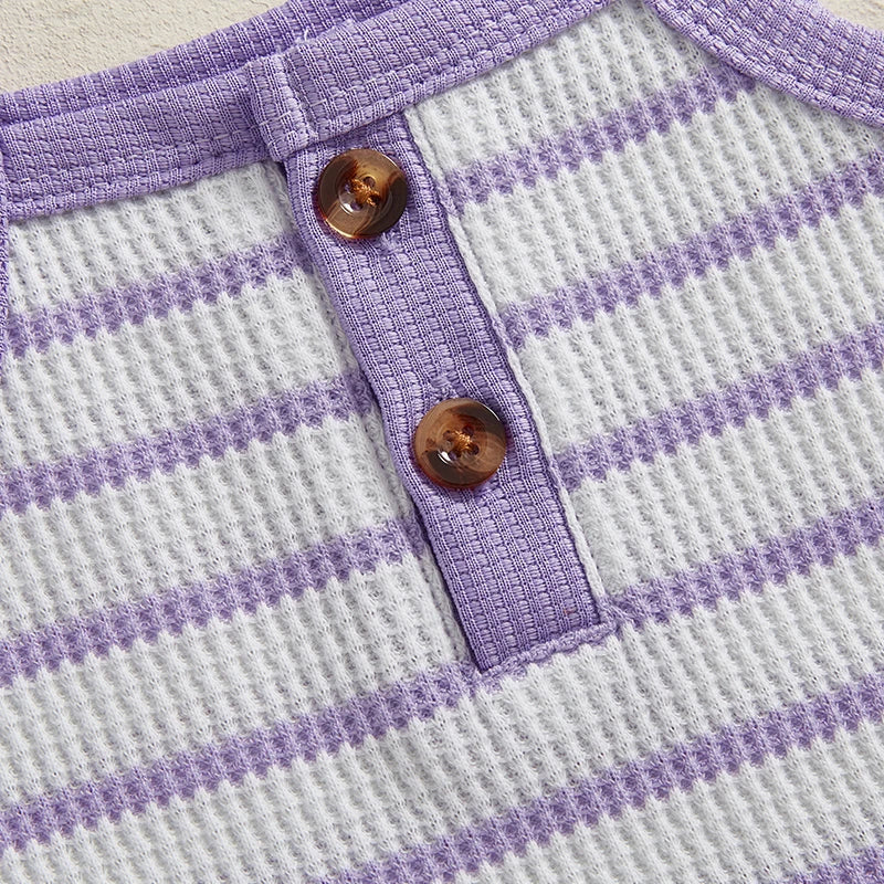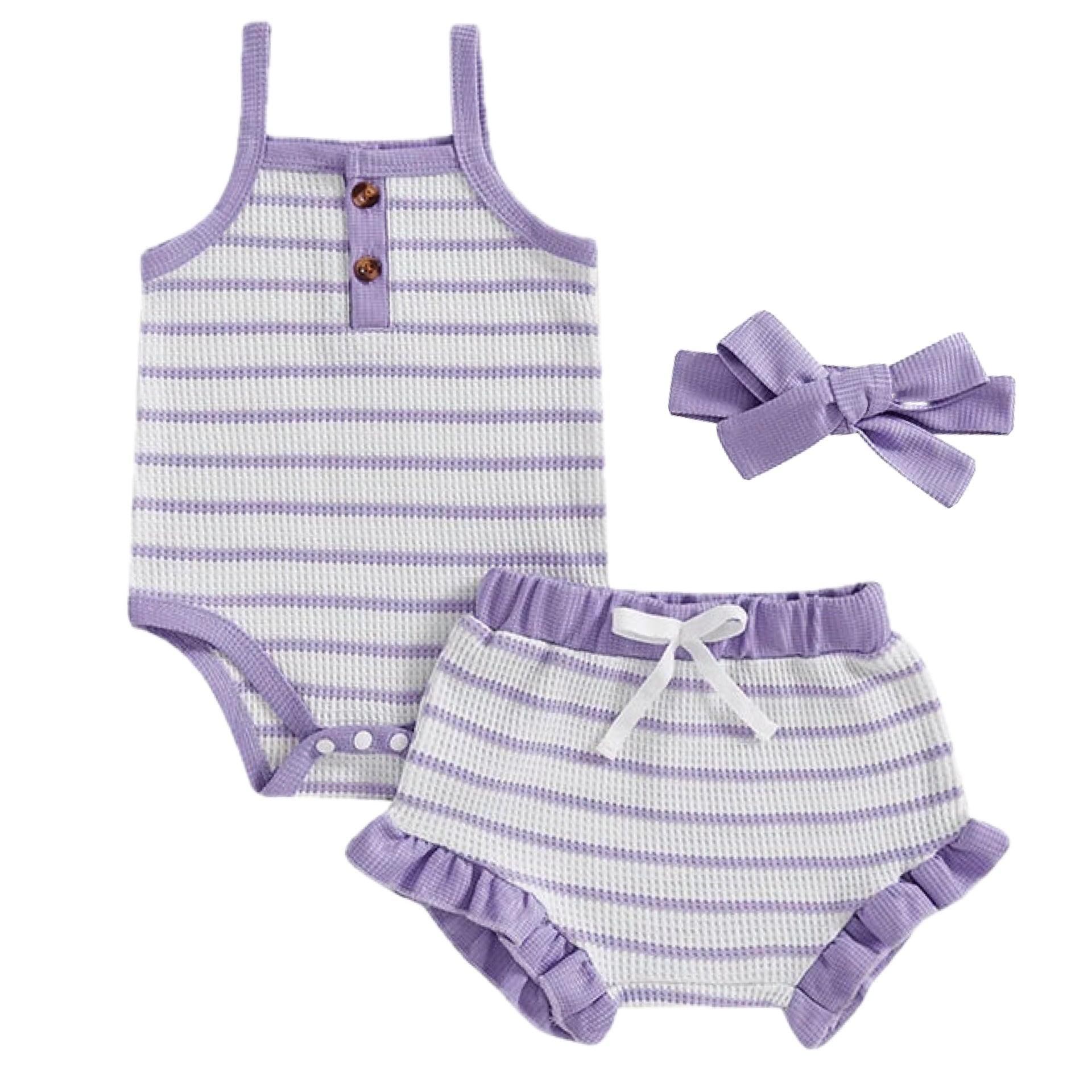 Add a soft pop of colour to her wardrobe with this sweet purple waffle set. The romper features delicate stripes and pairs perfectly with the fluttery frill shorts and coordinating topknot bow. Made from a lightweight waffle cotton blend, it’s ideal for warm days, special outings, or simply looking cute at home. A lovely everyday essential with just the right amount of flair.