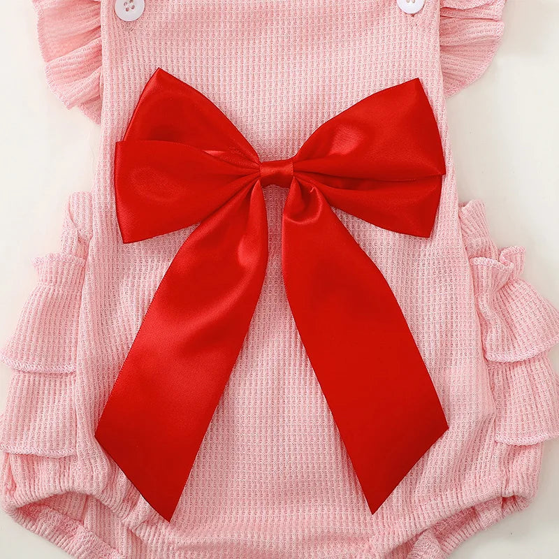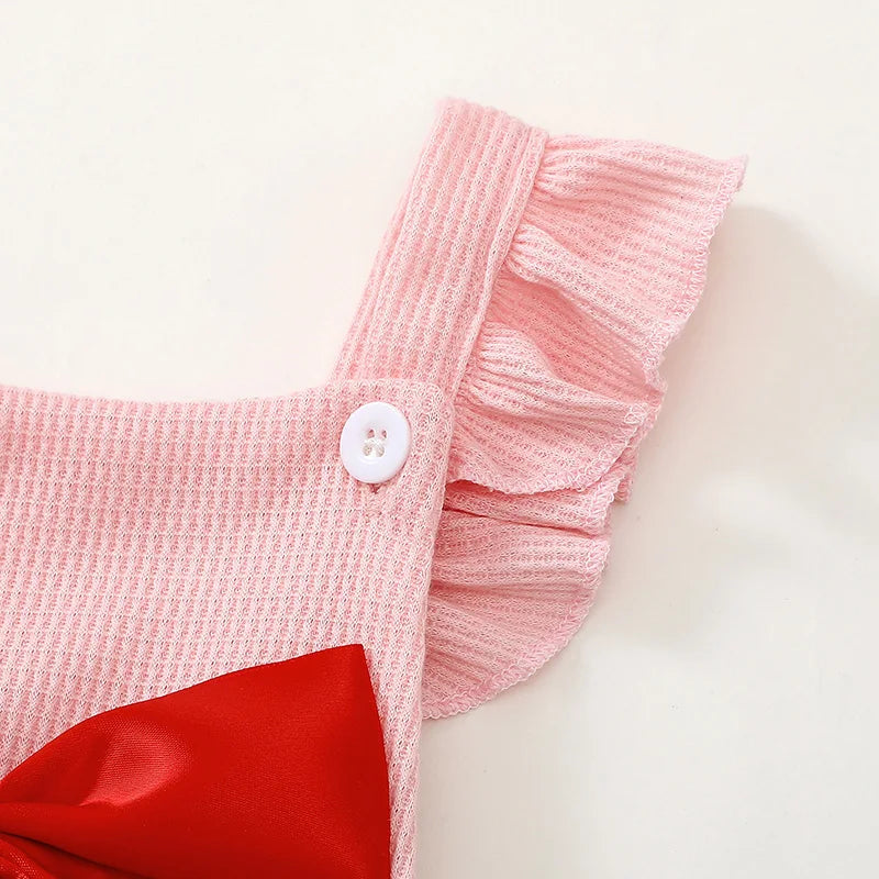 The back features layered ruffles, giving that adorable bloomer-style finish perfect for photos and celebrations. On the front, a delicate satin grosgrain bow completes the outfit with a timeless, festive feel- perfect for Christmas Day, Santa photos, family events or simply looking cute at home.