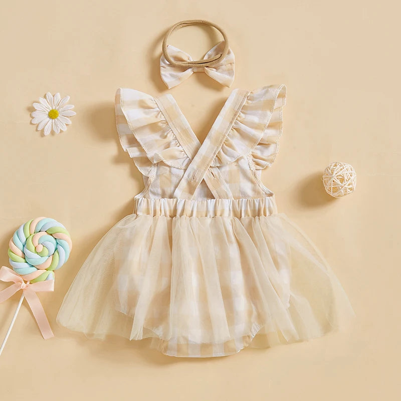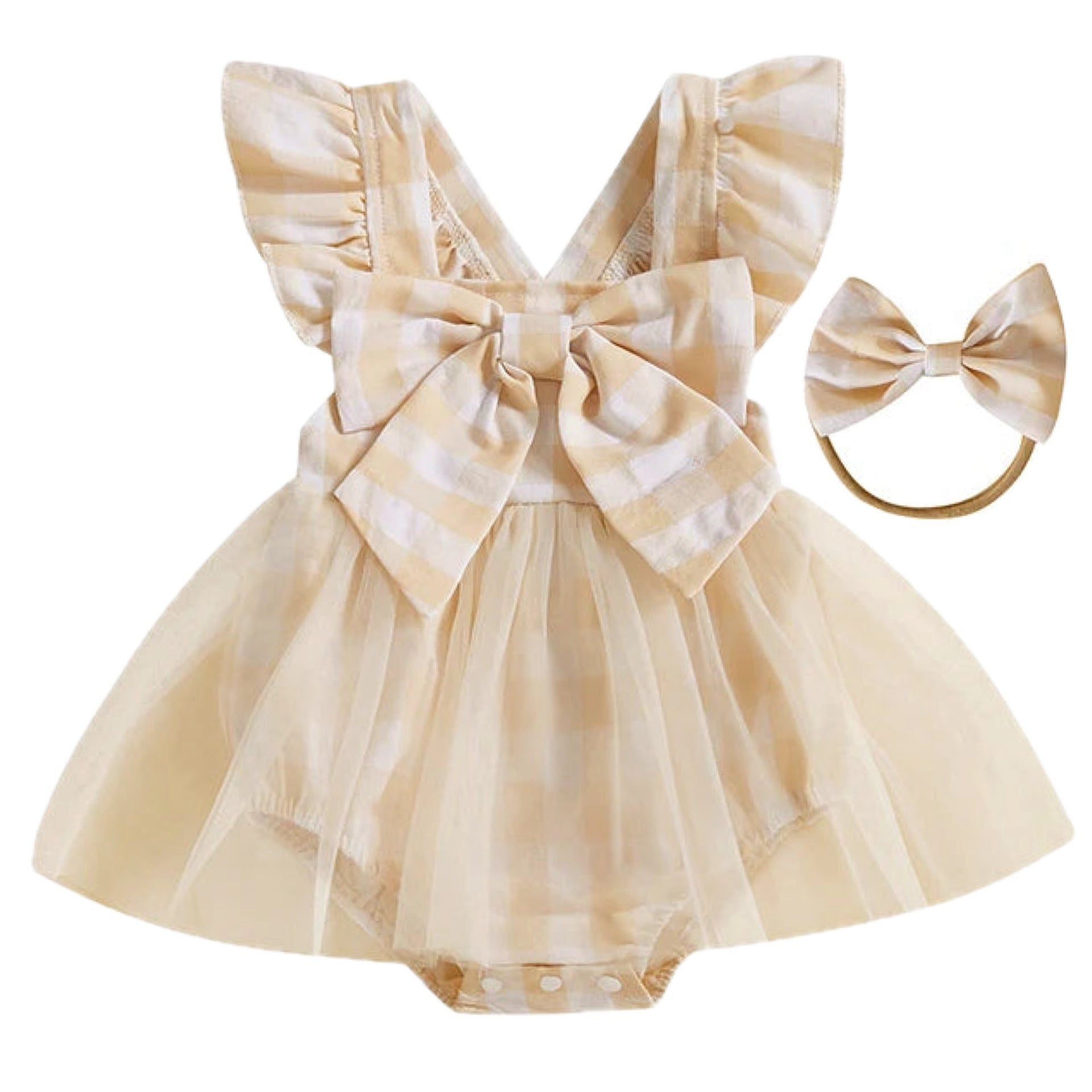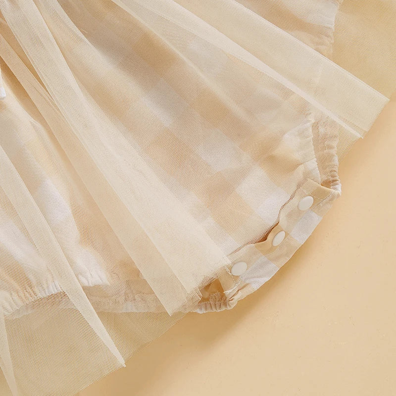 Gingham Bow Tulle Romper Set Beige