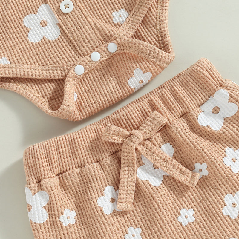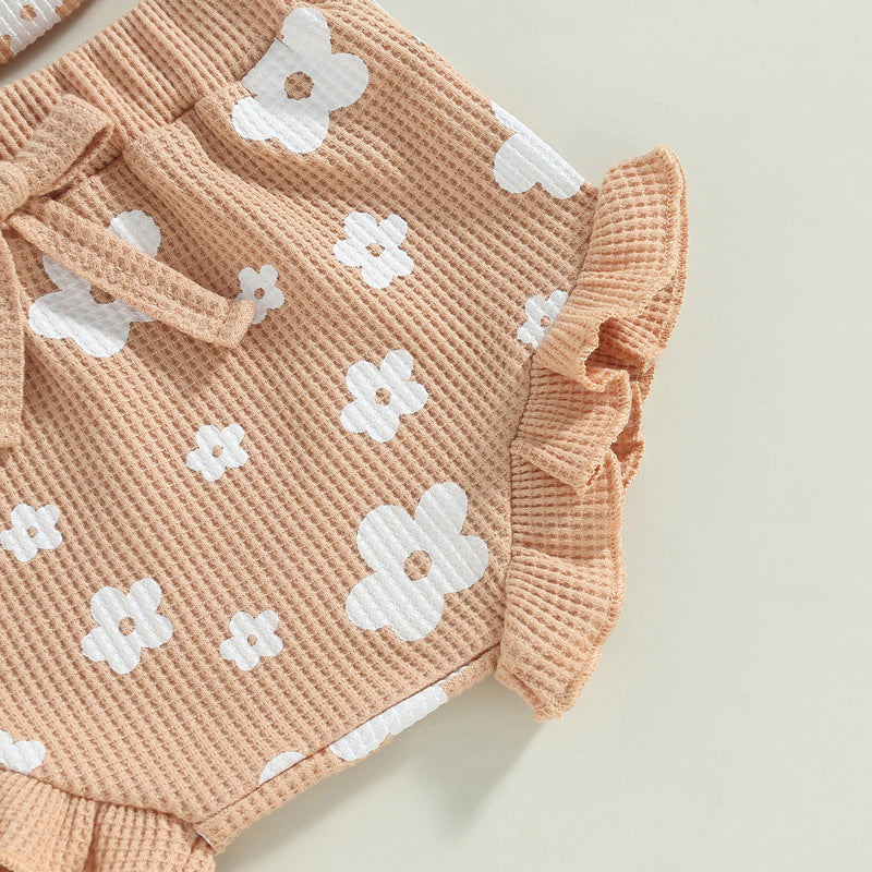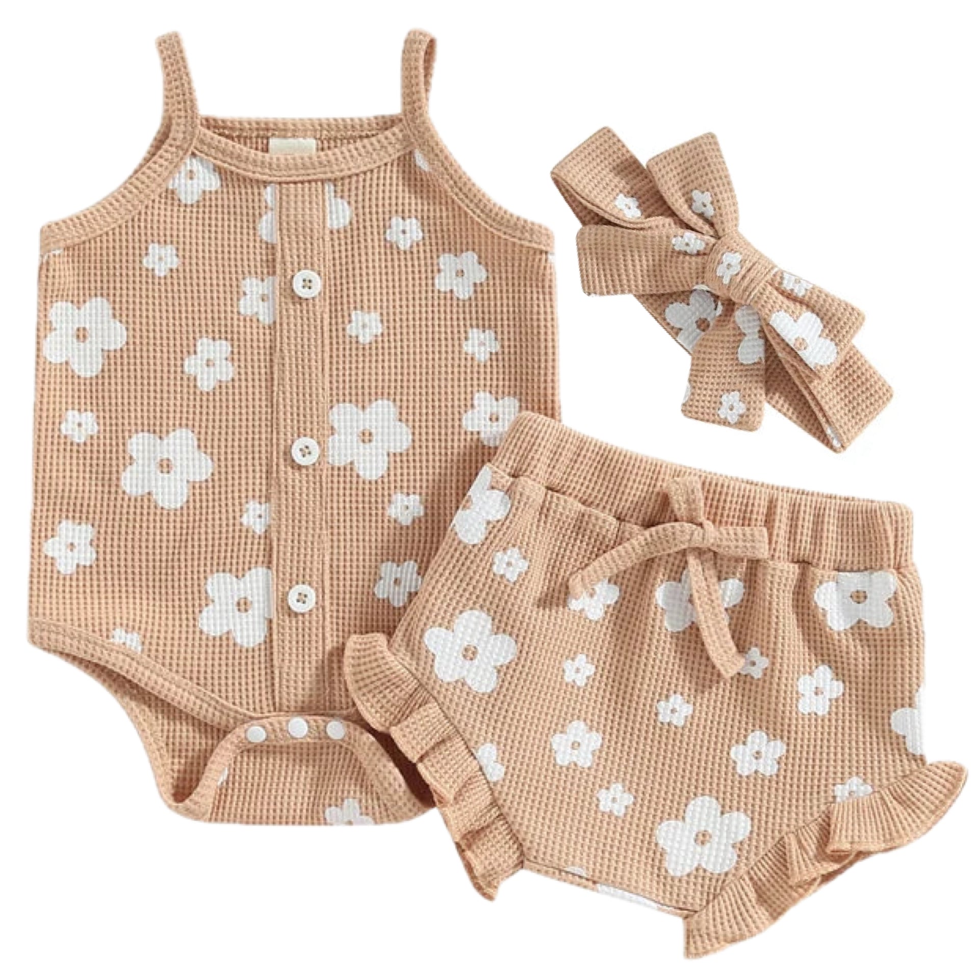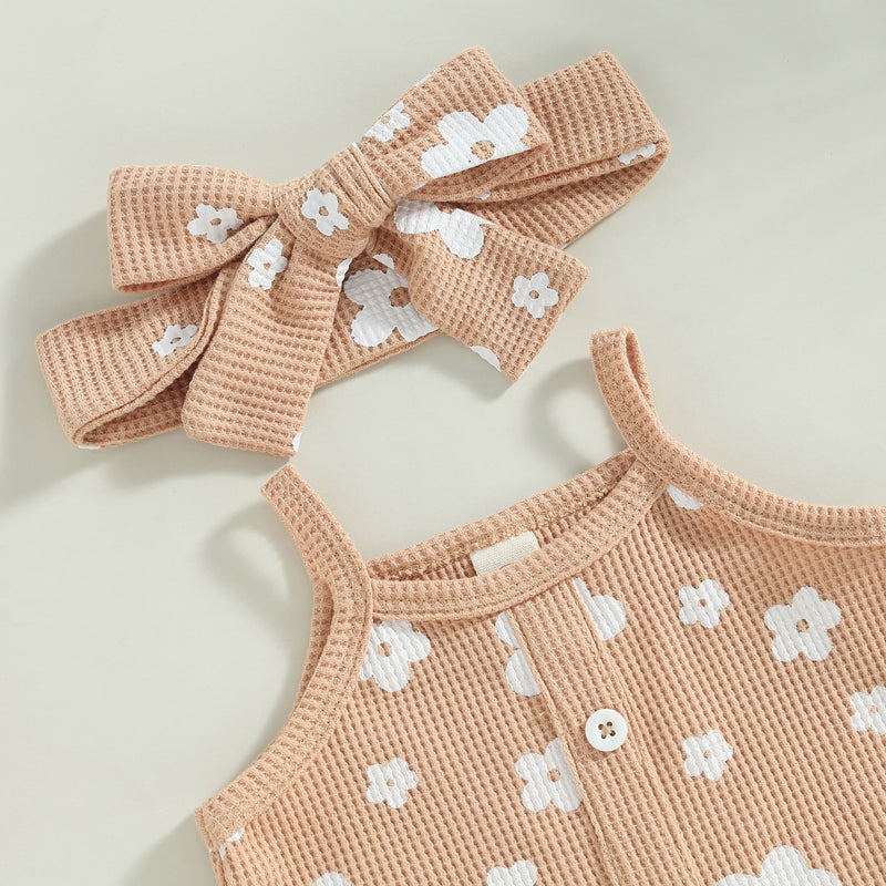 Made from soft ribbed cotton, this three-piece set includes a sleeveless button-front romper, matching ruffle shorts, and a coordinating bow headband. The neutral floral print adds a timeless touch, making it perfect for playdates, outings, or relaxed days at home.