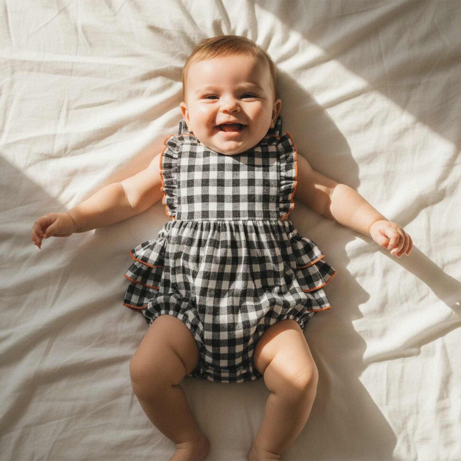 Classic with a playful edge, the Gingham Ruffle Baby Girl Romper in Black & White is a timeless piece designed for everyday wear and special outings alike. Made from a soft cotton blend with a hint of stretch, this romper features a traditional black and white gingham pattern, finished with layered ruffle details trimmed in a subtle contrast stitch for added charm.